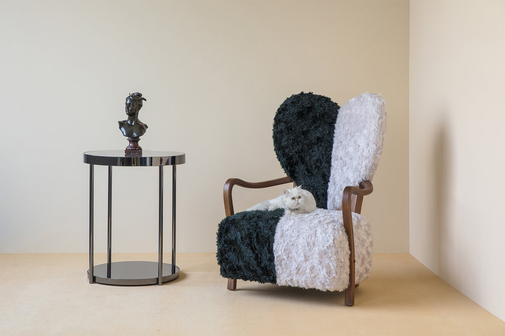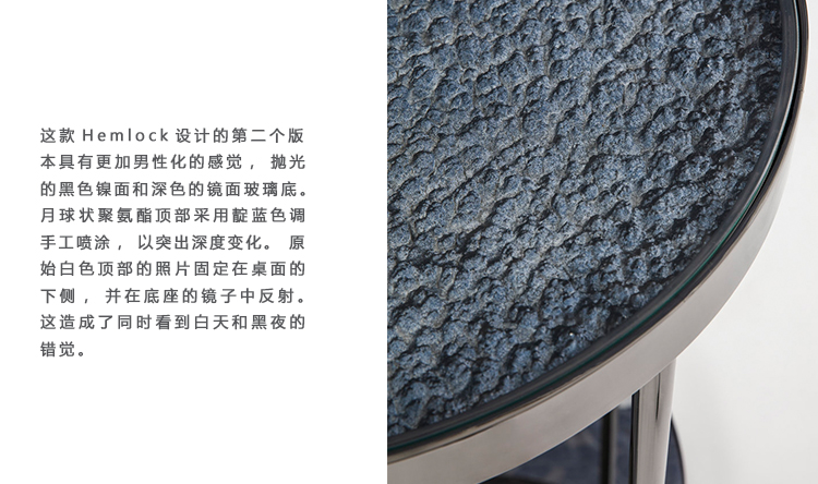 这款Hemlock设计的第二个版本具有更加男性化的感觉,抛光的黑色镍面和深色的镜面玻璃底。 月球状聚氨酯顶部采用靛蓝色调手工喷涂,以突出深度变化。原始白色顶部的照片固定在桌面的下侧,并在底座的镜子中反射。 这造成了同时看到白天和黑夜的错觉。