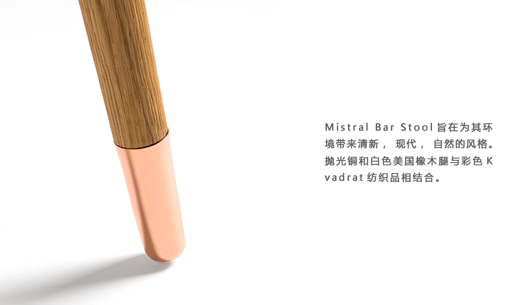 Mistral Bar Stool( 米斯特拉尔吧椅)旨在为其环境带来清新,现代,自然的风格。 抛光铜和白色美国橡木腿与彩色Kvadrat纺织品相结合。