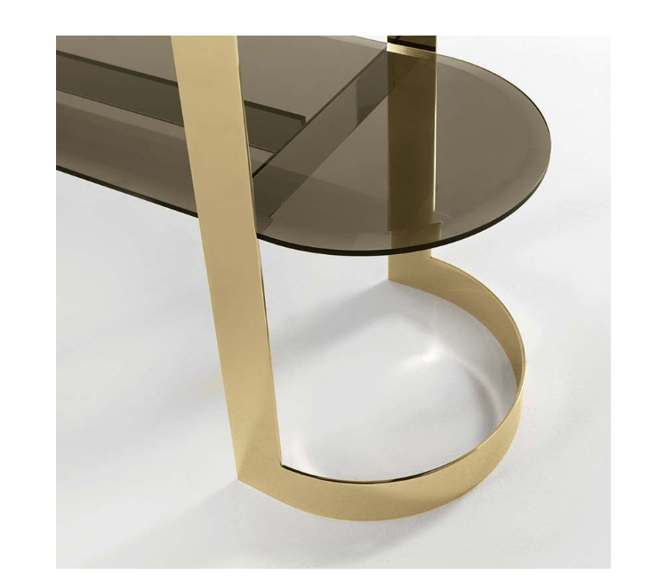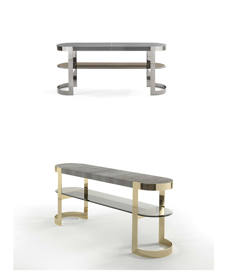 一种控制台,其基本轮廓将大理石或皮革与玻璃和金属相结合,以达到形式上的完美。