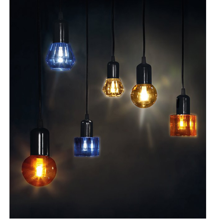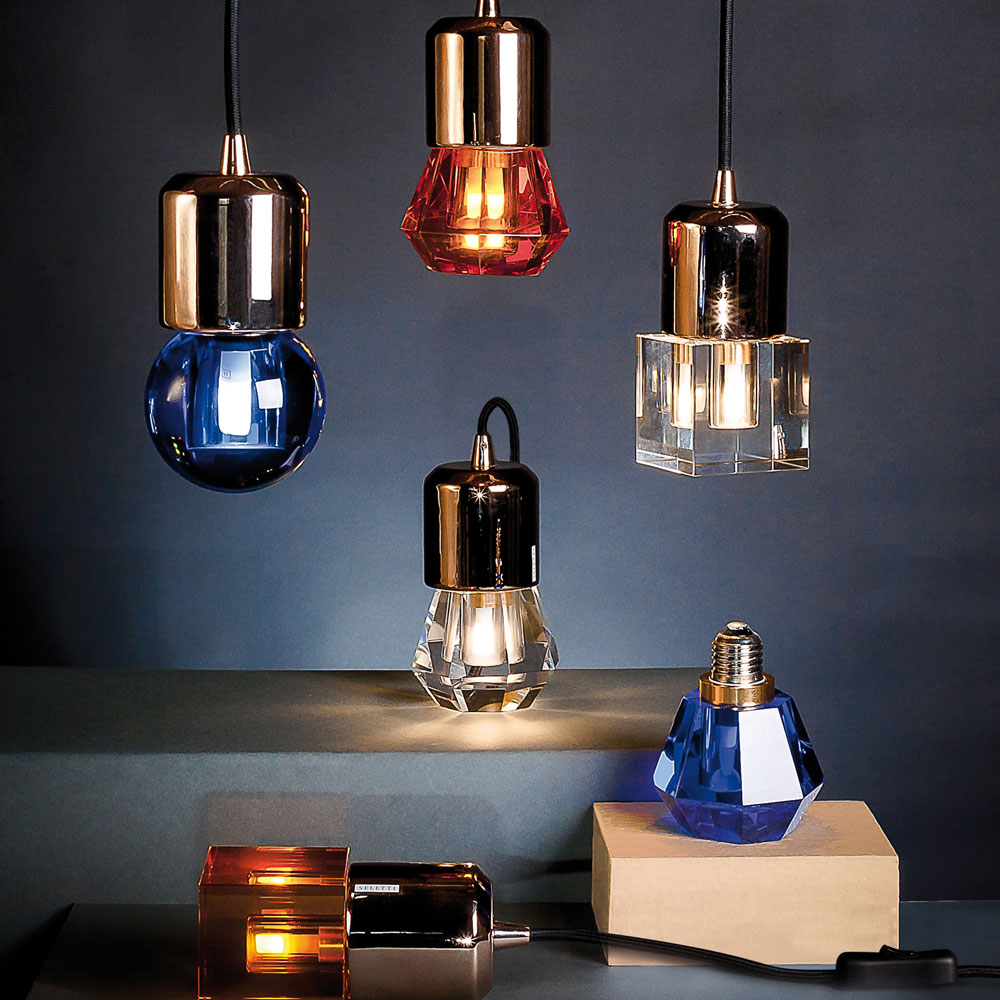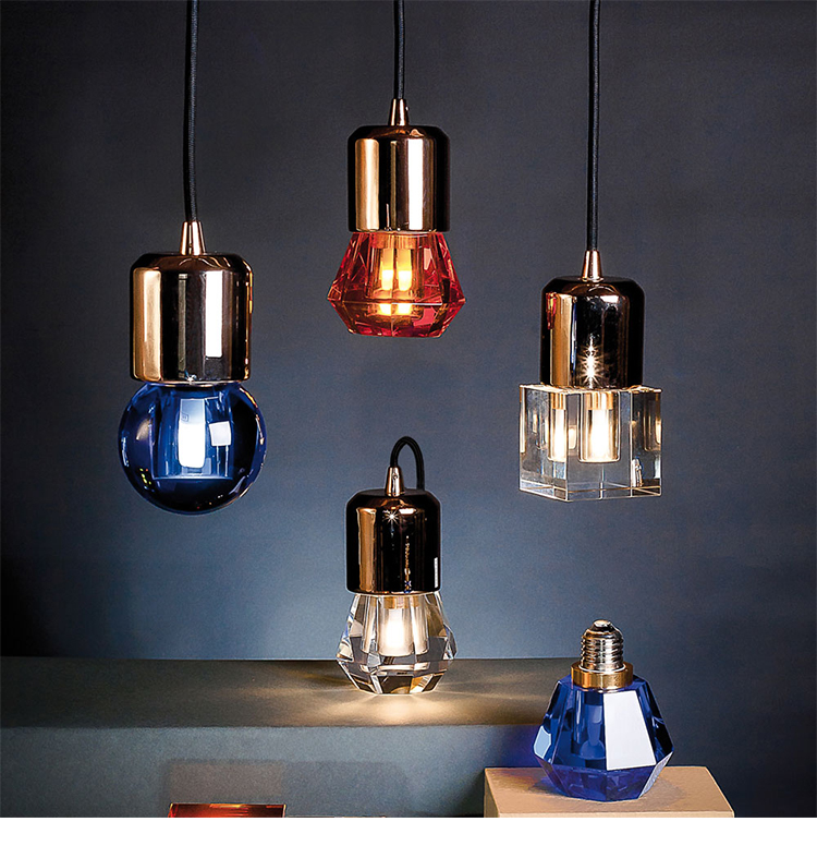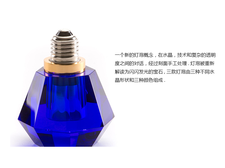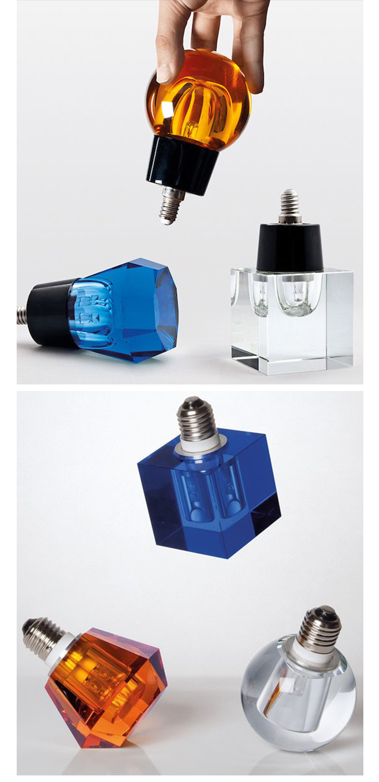一个新的灯泡概念,在水晶,技术和复杂的透明度之间的对话,经过刻面手工处理.灯泡被重新解读为闪闪发光的宝石,三款灯泡由三种不同水晶形状和三种颜色组成.