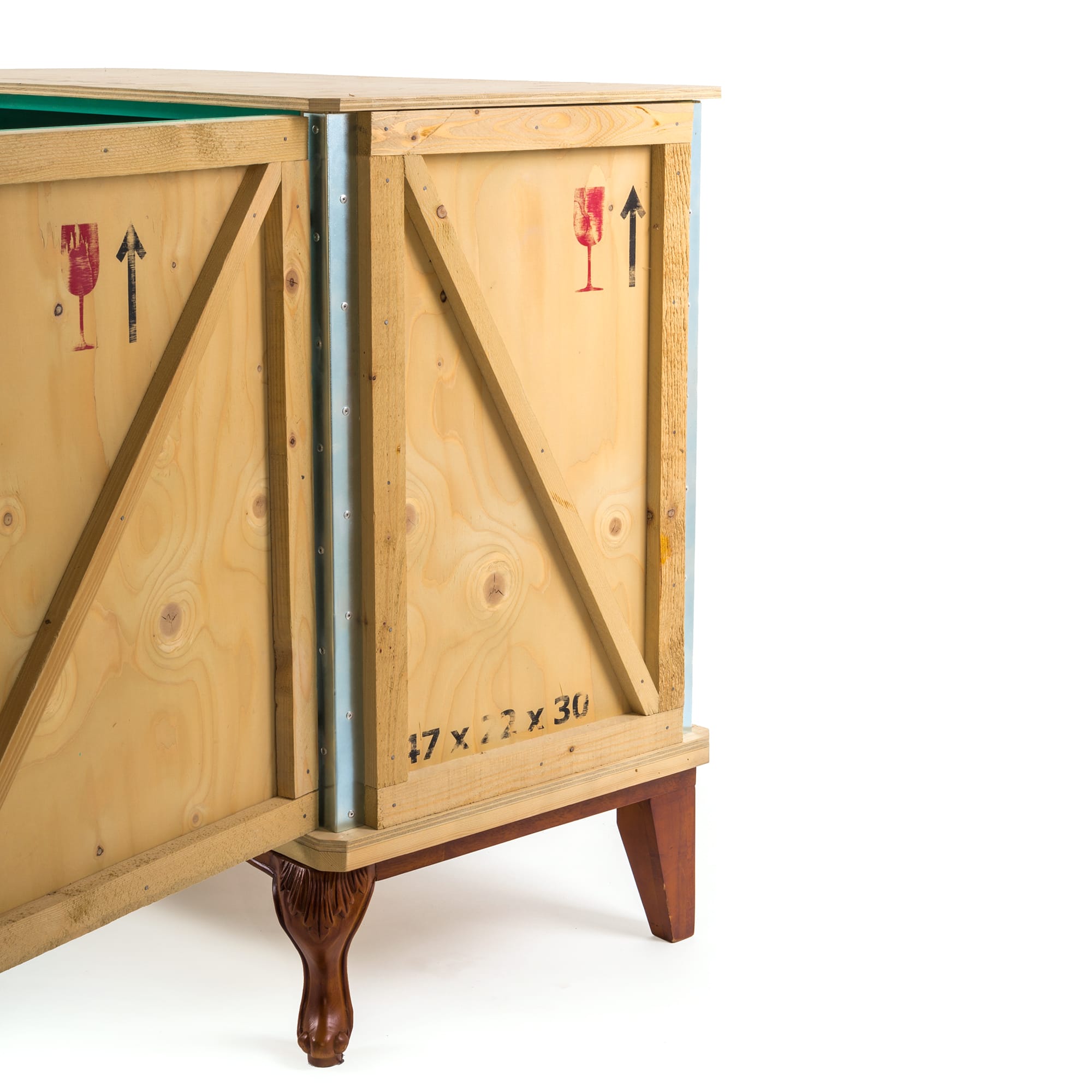 Designed by Marcantonio Raimondi Malerba for Seletti, this modern bedside table blends two different styles in one quirky design. A packing case boasting various labels and signs is paired with ornate Louis XIV legs. The bright green interior features one shelf and two storage spaces. Handmade from solid wood, this Export Como Bedside Table is as impressive in its durability as it is in its distinctive design. It can be used on its own to create a focal point in a bedroom or alongside other pieces of furniture from the Export Como collection. Made in Italy.