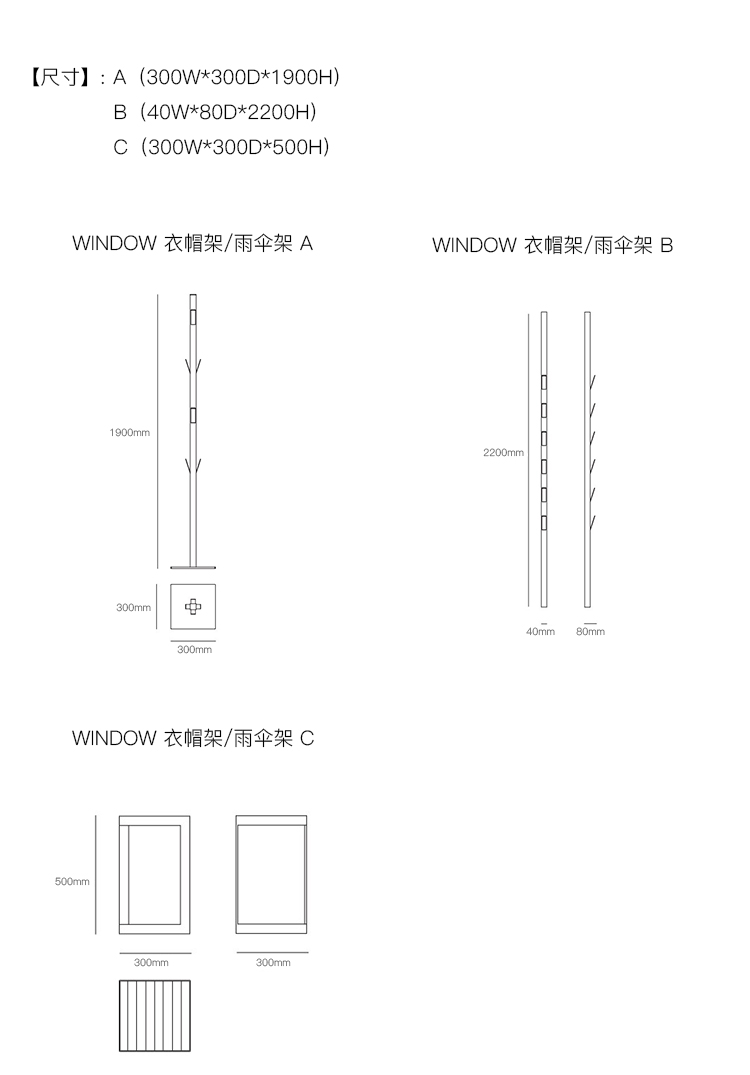 WINDOW 衣帽架/雨伞架 系列尺寸/示意图