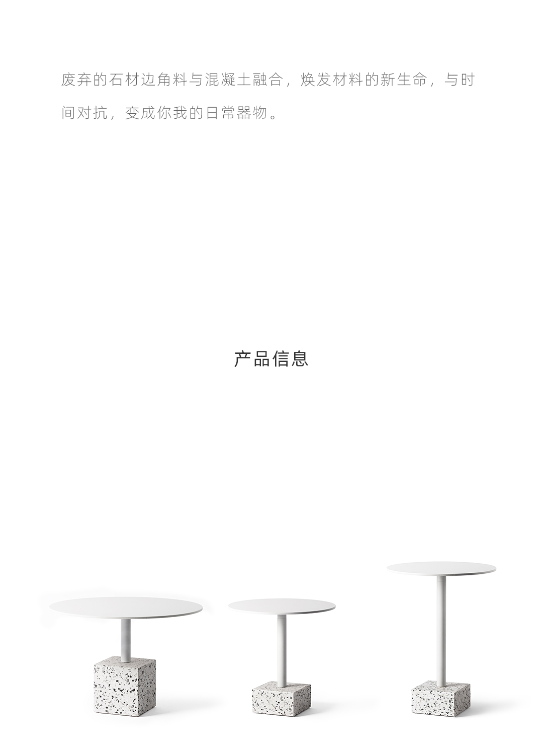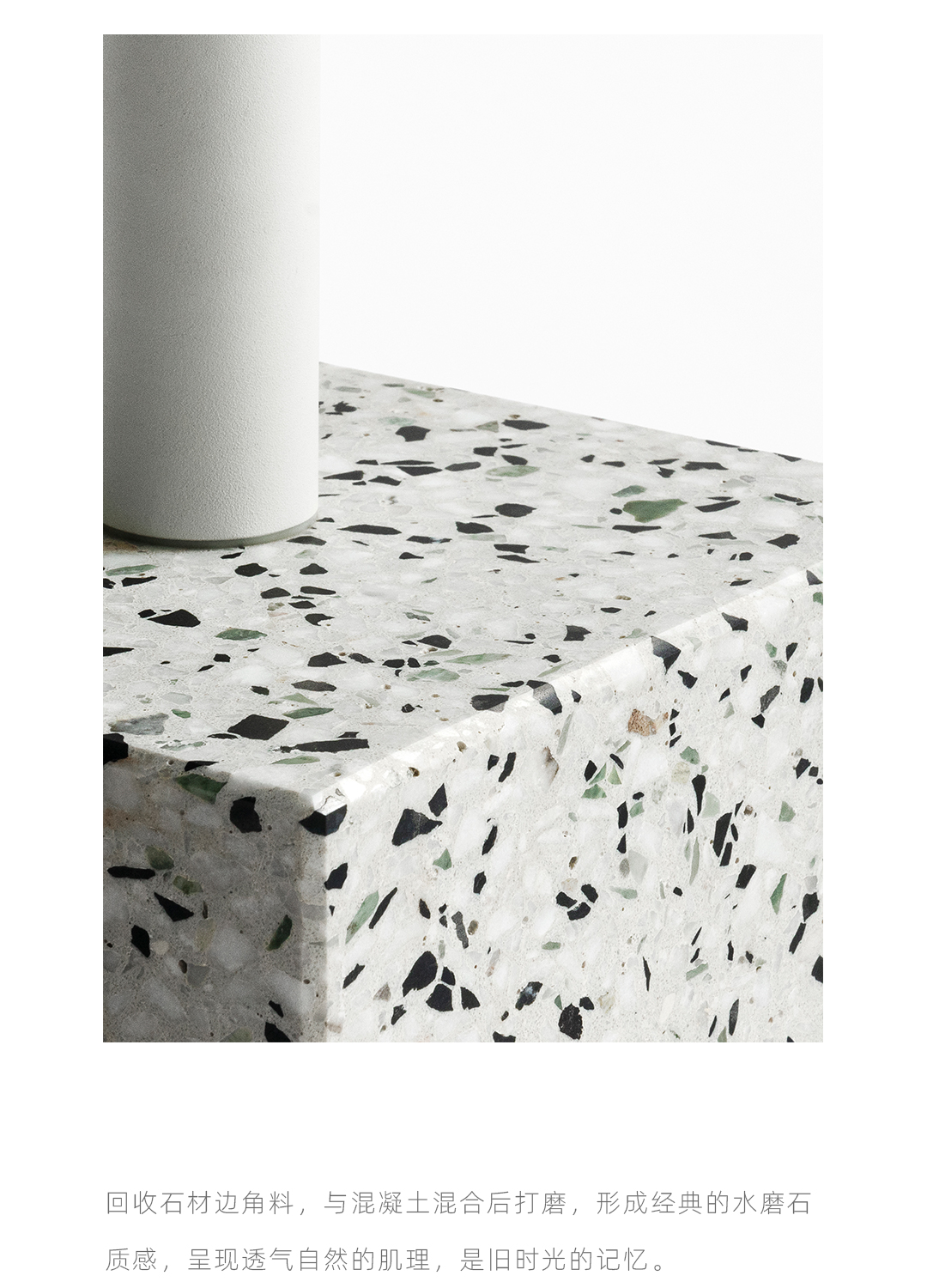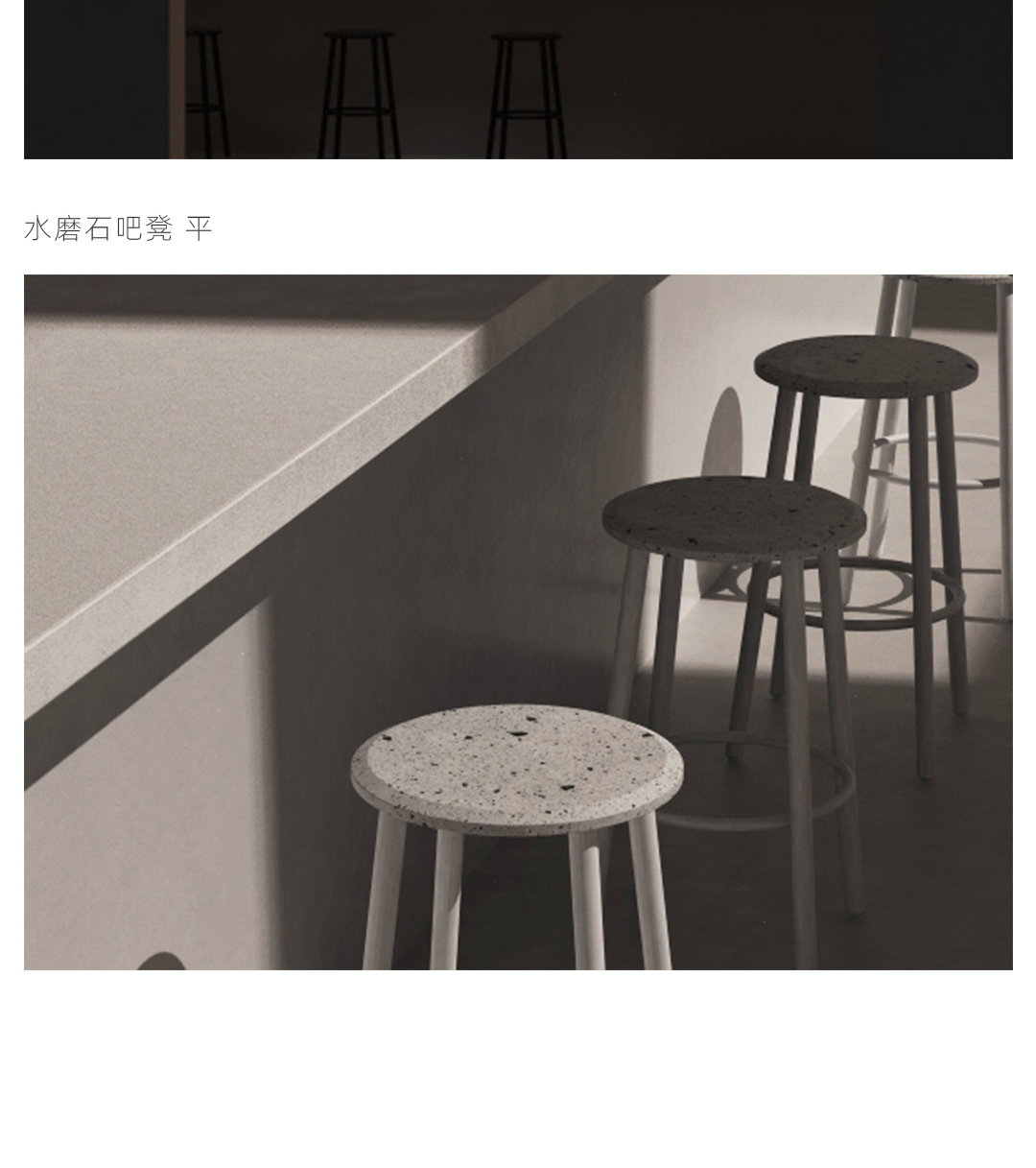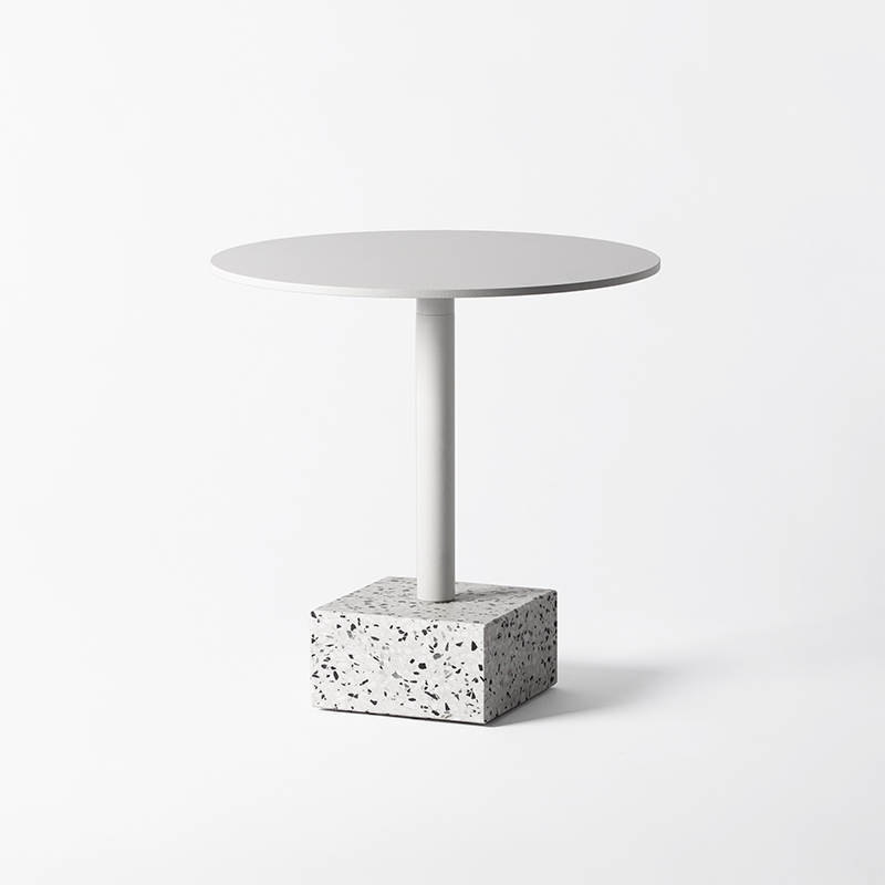 水磨石边几 全铝金属桌面不生锈,耐候粉末喷涂抗紫外线耐候不变色,致密表面防油污,室内户外通用。 全铝精密加工,部件均可拆卸,减少包装体积,降低运输成本。 回收石材边角料,与混凝土混合后打磨,形成经典的水磨石质感,呈现透气自然的机理,是旧时光的记忆。 简约黑白的经典搭配,致密的材料应用,便于清洁维护,适应户外、室内各类风格的公共区域。