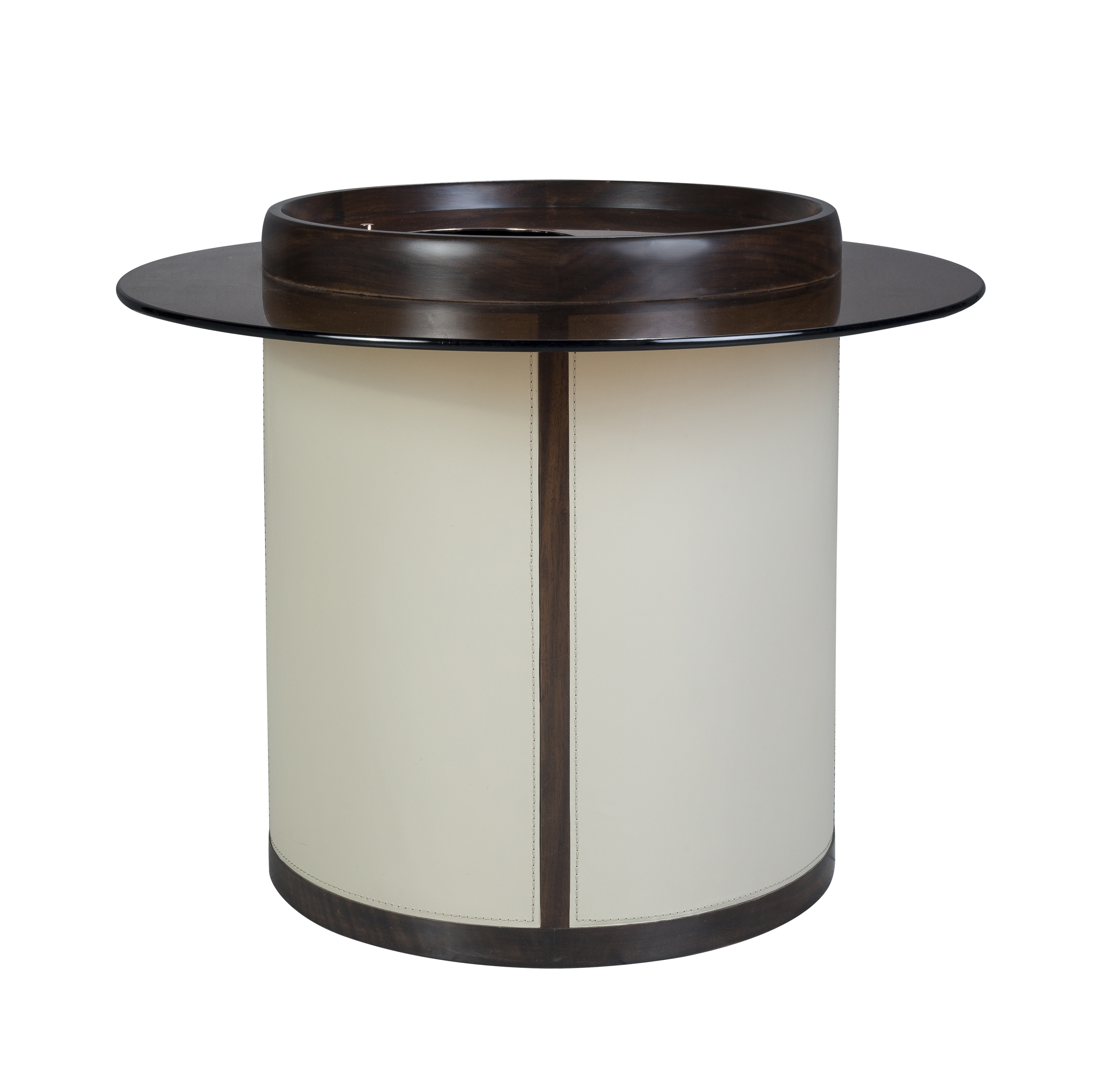 1.黑胡桃木边框与茶色玻璃的组合,勾勒出休闲几的精巧简练。 2.通过转动茶几面铜制拉手,可打开不同区域物品,功能分区强。 3.休闲几小巧干练,可根据需要随意进行家居布置。