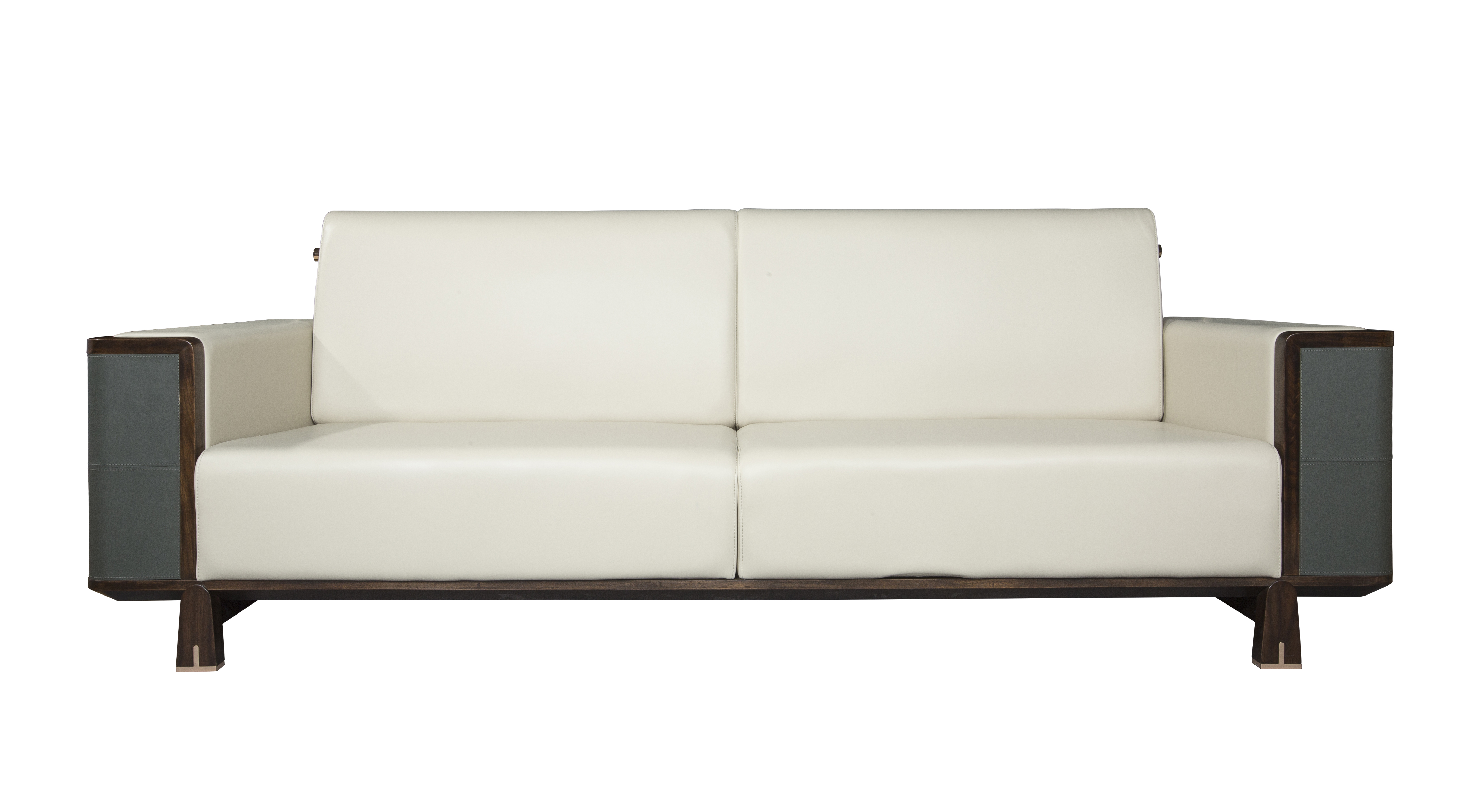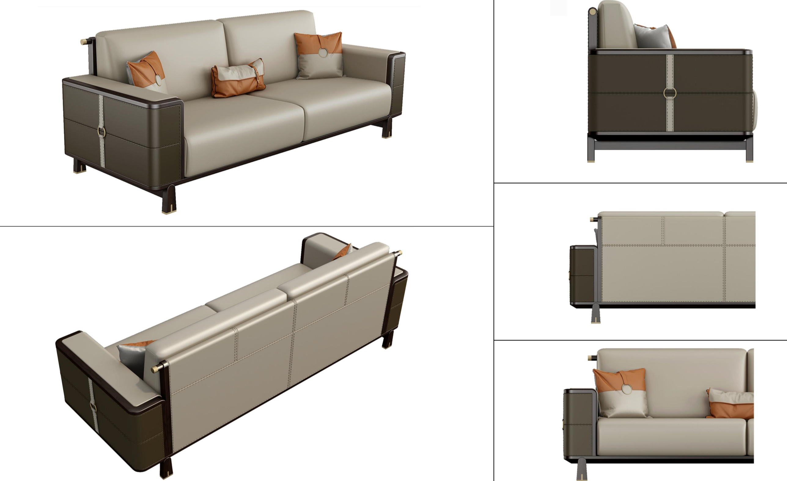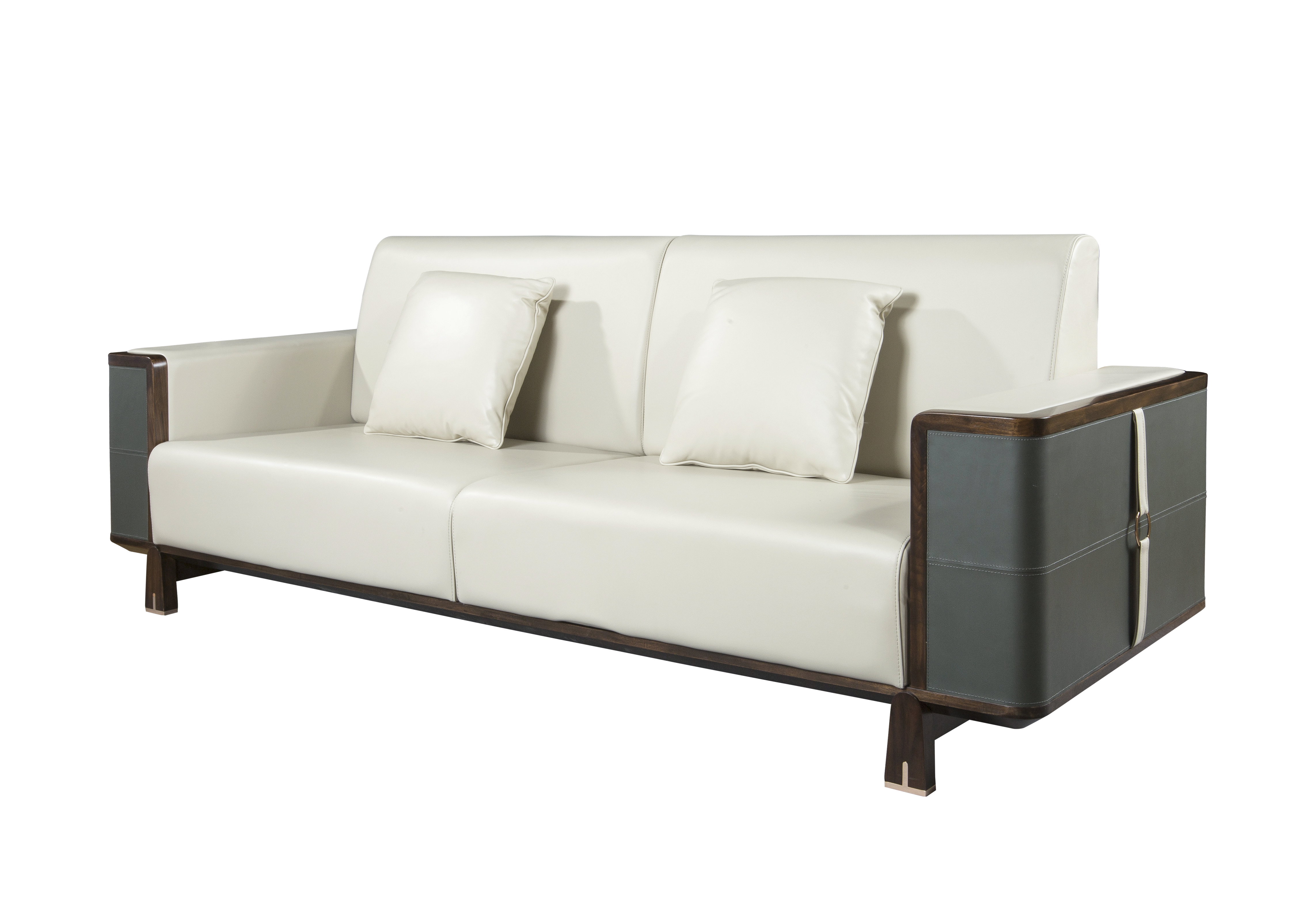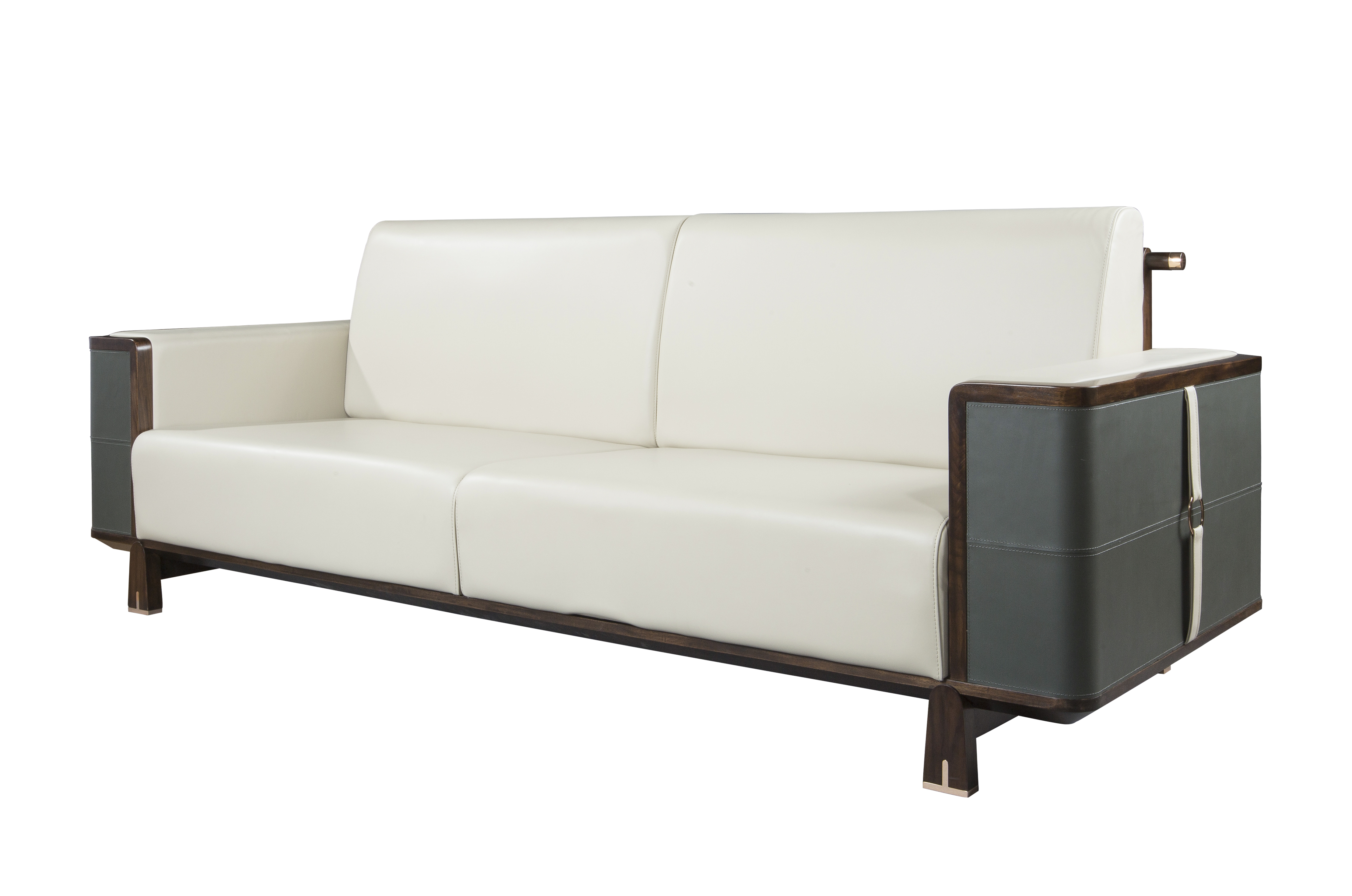 1.沙发靠背形制源于中式两出头官帽,有着飞黄腾达、仕途一帆风顺的美好寓意。 2.意大利进口牛皮坐垫包饰,舒适耐用,质感十足。 3.沙发扶手外侧采用铜制圆形锁扣造型设计,寓意天圆地方。同时抱枕造型与此呼应。 4.沙发扶手外侧采用马鞍革硬包,里侧采用进口牛皮包饰,造型别致,彰显价值。 5.铜脚设计,赋予中式韵味的同时以防磨损。