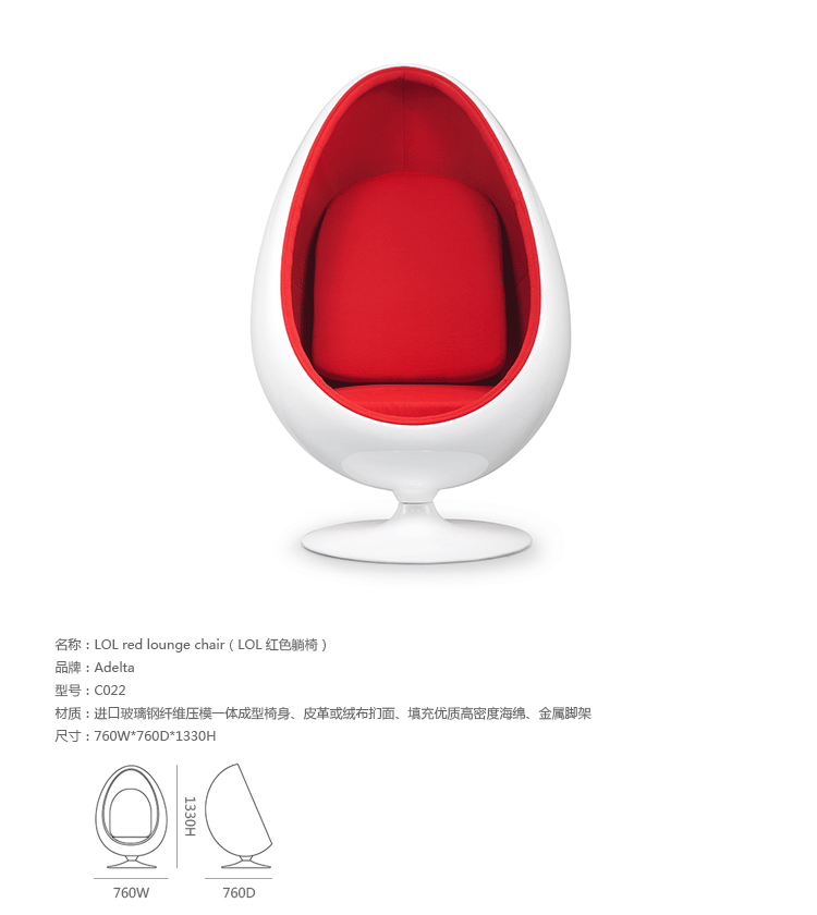 LOL red lounge chair(LOL 红色躺椅)是设计大师Eero Aarnio的作品,设计雏形为其设计的Egg chair,是介乎于家具和建筑之间的一种产品,它好像“房间里的房间”,椅子很矮,坐进去,就仿佛陷入另外的一个世界,能迅速拥有安静舒适的环境,外界的噪音也被抵挡住。可以躲在里面冥想、放松身心,或者打私人电话。设计师阿尼奥就在自己那把原版的“球椅”内壁上装了一个红色的电话机,“球椅”提供一个相对私密的空间。椅子底部有轴,能360度旋转,坐在里面的人向外看,眼前的风景会随着转动而改变。这样,即使蜷缩在椅子里,也不会有与外界完全隔离的孤独感。就是这样一个狭小的空间,却带给了人们无比的安全感与舒适感,也就是这把椅子的诞生,掀开了“PODLIFE” 的篇章。