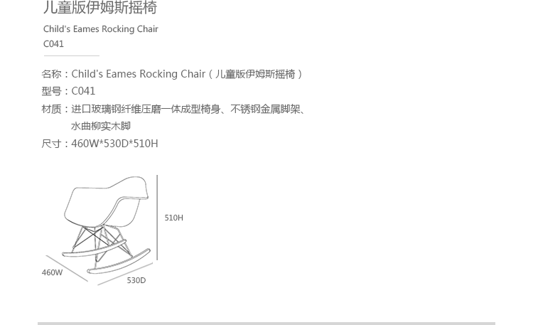 Charles Eames&Ray Eames伊姆斯夫妇是20世纪美国设计界最完美的一对伴侣,在分工上Charles主要从技术、材料和生产的角度来考虑问题,而Ray则更多地考虑形式、空间和审美。他们将结构、功能、心理、美学等元素贯穿于产品设计的各个方面。他们的设计实践极大地丰富了现代设计的理论。伊姆斯夫妇一生设计了很多产品,几乎都是经典之作,伊姆斯夫妇设计的产品都有着一种现代、简约的气息。这款Child's Eames Rocking Chair(儿童版伊姆斯摇椅)是伊姆斯摇椅的儿童版,专为小朋友设计的小型号,是由伊姆斯夫妇在20世纪50年代的时候设计的,摇椅外形宛如一朵盛开的郁金香,款式现代、时尚、美观、 实用,是一个非常具有个性化的设计作品。被视作一件放置在家中的艺术品,摇椅的表面采用出模一次成型,使得表面光滑平整,拐角 处圆滑。精心设计的座位、靠背与扶手连 成一体,更具有人性化。