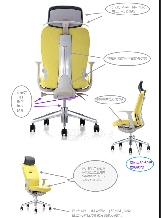 管和底盘,底盘有升降、摇摆、销定、倾仰,座包有前后调节功能。座、背采用50