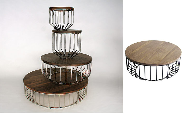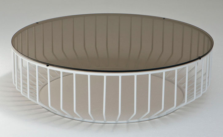 "Blending sloping angles and taut lengths of bent metal are a modern interpretation of the wiry idea initially conceived by Warren Platner.The series is made up of a suite of tables,side tables and benches and fitted with luxurious solid wood,glass,or upholstered tops.By choosing the upholstered top the coffee table can serve as an ottoman."