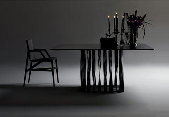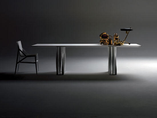 不锈钢电镀折叠而成独特脚架——大胆挑战由薄金属垂直条、微扭纵轴形成的桌几支撑,为家庭创造一个独特的景观