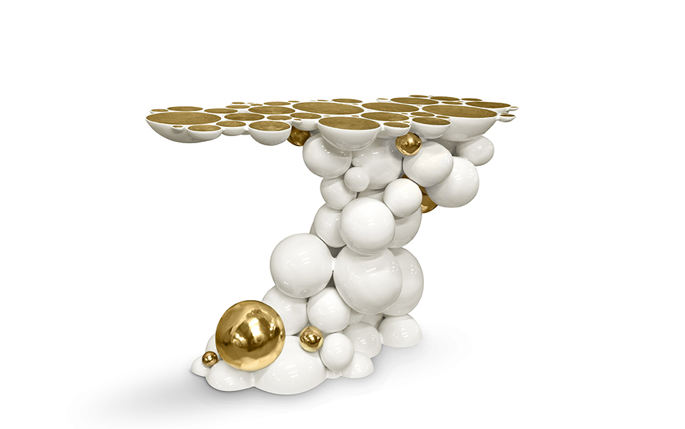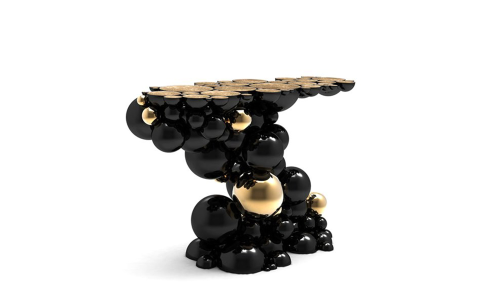 After our recent outstanding moment of inspiration - the creation of Newton dining table - we conceived a console inspired by this exclusive piece of furniture. Once again, we defy the laws of physics and redesigned this monumental console made from aluminum and lacquered in black, with a high gloss varnish. The spheres and semi spheres that complete this futuristic console are gold plated. This intriguing console is ideal for any modern living rooms, bedrooms and hotel lobbies characterized by luxury interior design furnishings.