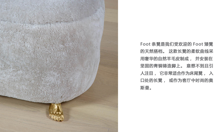 Foot Bench是我们受欢迎的Foot Stool的天然搭档。 这款长凳的柔软曲线采用奢华的自然羊毛皮制成,并安装在坚固的青铜铸造脚上。 意想不到且引人注目,它非常适合作为床尾凳,入口处的长凳,或作为客厅中时尚的奥斯曼。