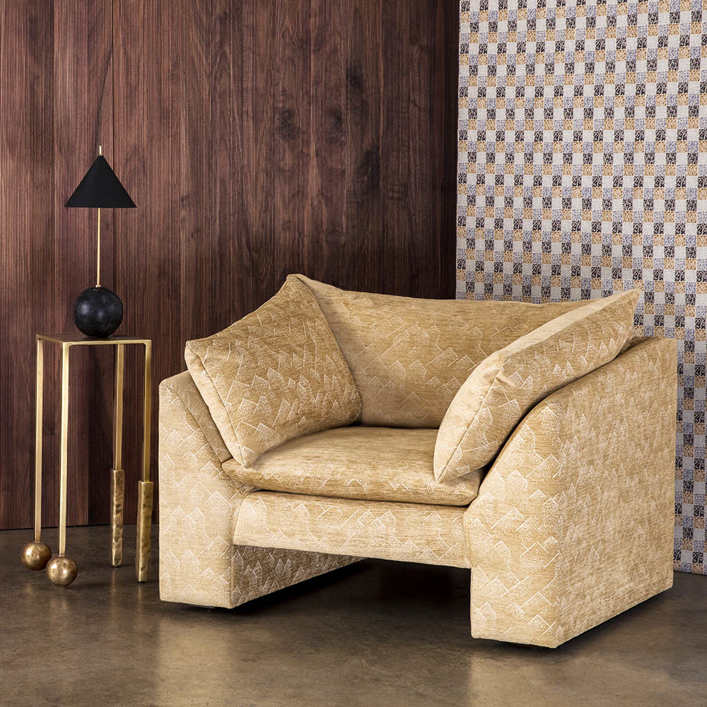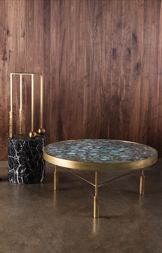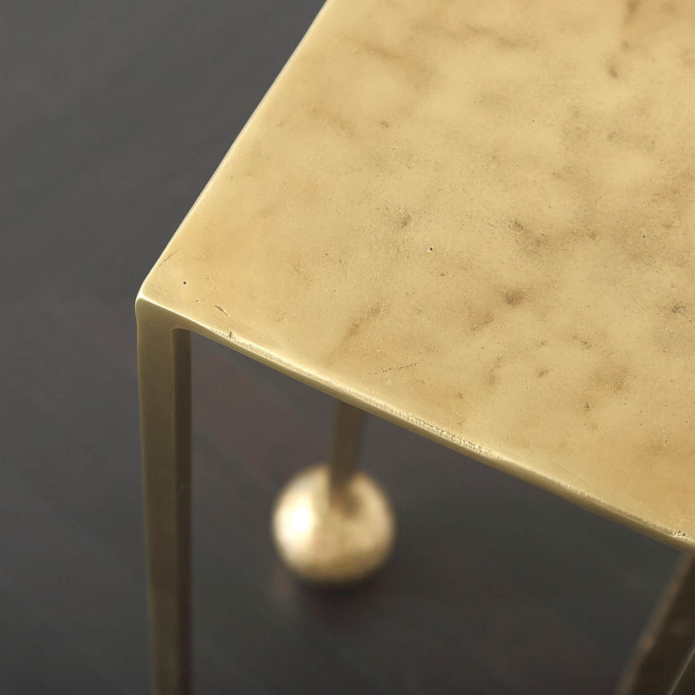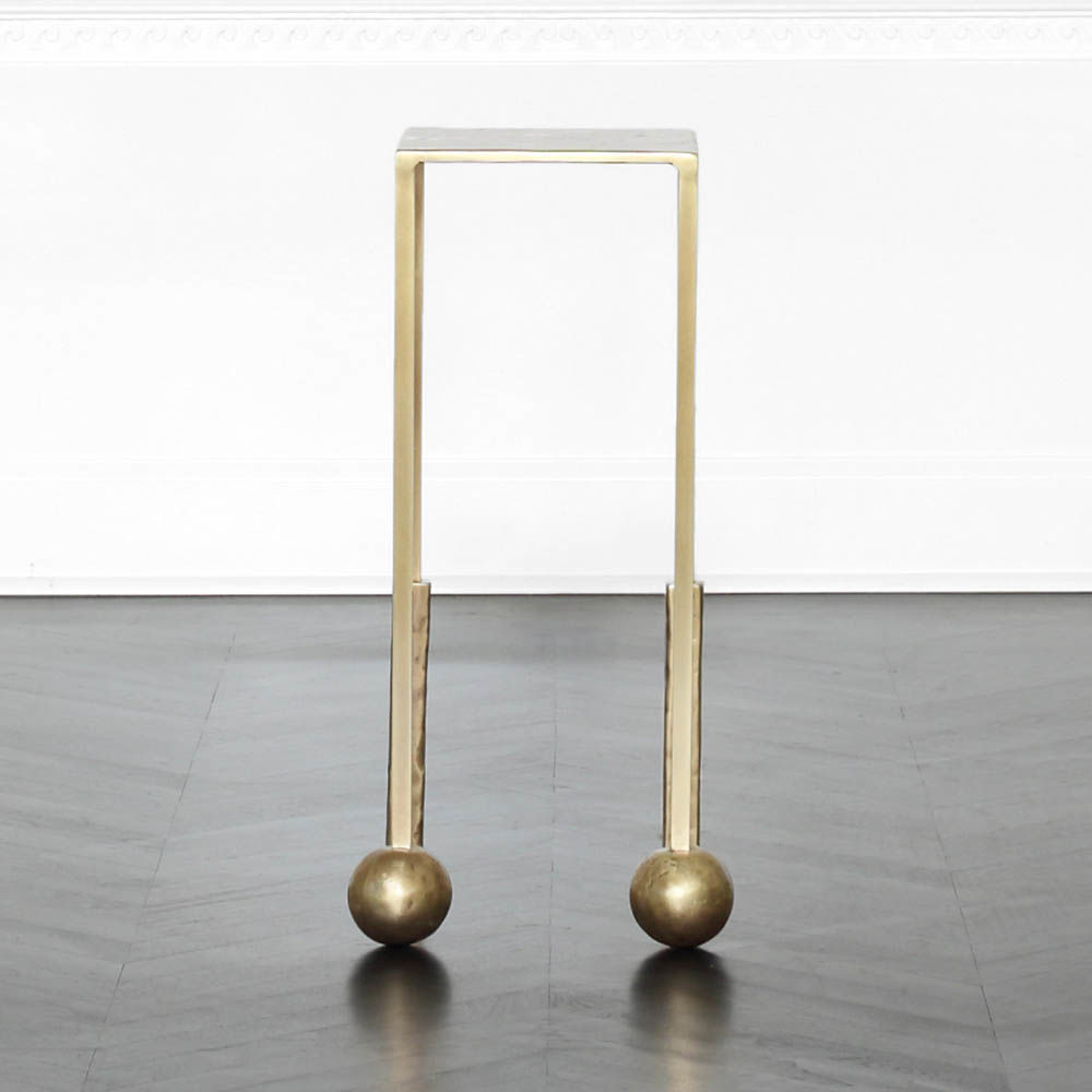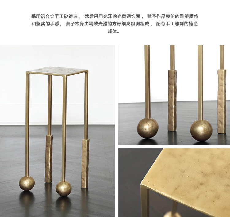 Nimes Petite Cocktail Table(尼姆小巧鸡尾酒桌)采用铝合金手工砂铸造,然后采用光泽抛光黄铜饰面,赋予作品模仿的雕塑质感和坚实的手感。 桌子本身由精致光滑的方形细高跟腿组成,配有手工雕刻的铸造球体。