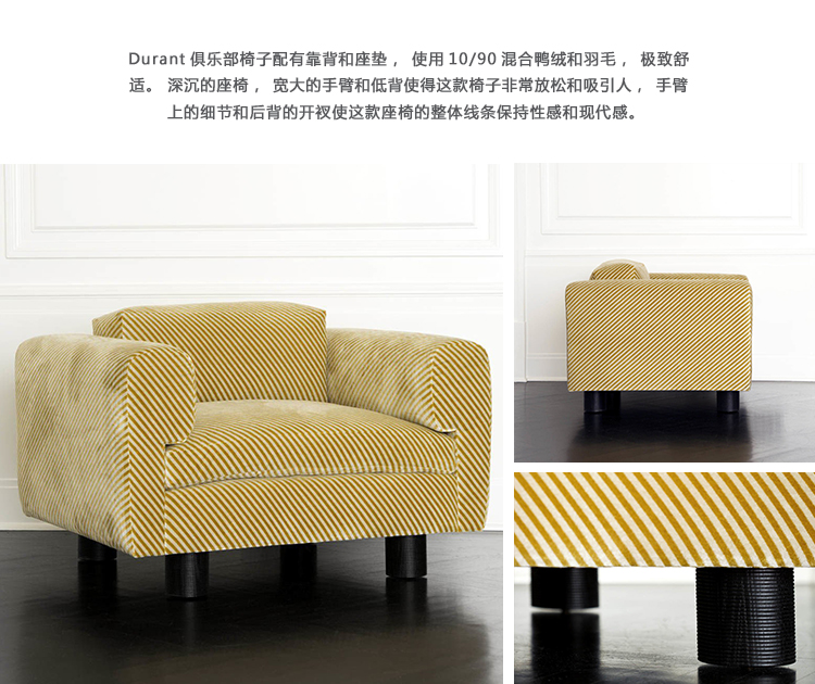 Durant俱乐部椅子配有靠背和座垫,使用10/90混合鸭绒和羽毛,极致舒适。 深沉的座椅,宽大的手臂和低背使得这款椅子非常放松和吸引人,手臂上的细节和后背的开衩使这款座椅的整体线条保持性感和现代感。 采用8向手动弹簧,我们的工程硬木框架依靠榫卯细木工,为质量和工艺设定了标准。 提供精选面料和皮革。