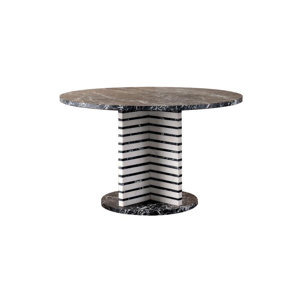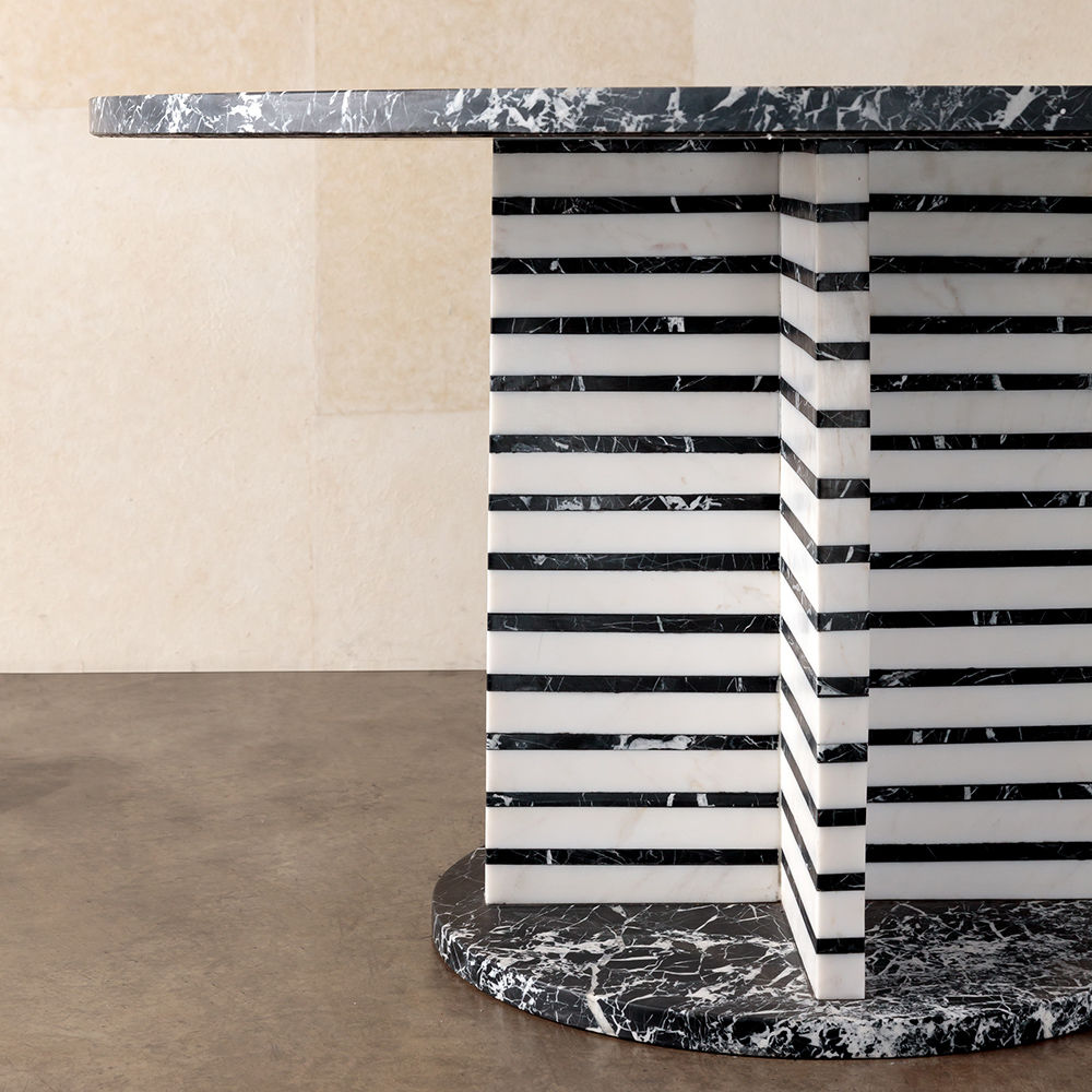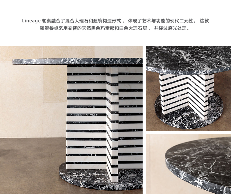 Lineage餐桌融合了混合大理石和建筑构造形式,体现了艺术与功能的现代二元性。 这款雕塑餐桌采用交替的天然黑色玛奎那和白色大理石层,并经过磨光处理。