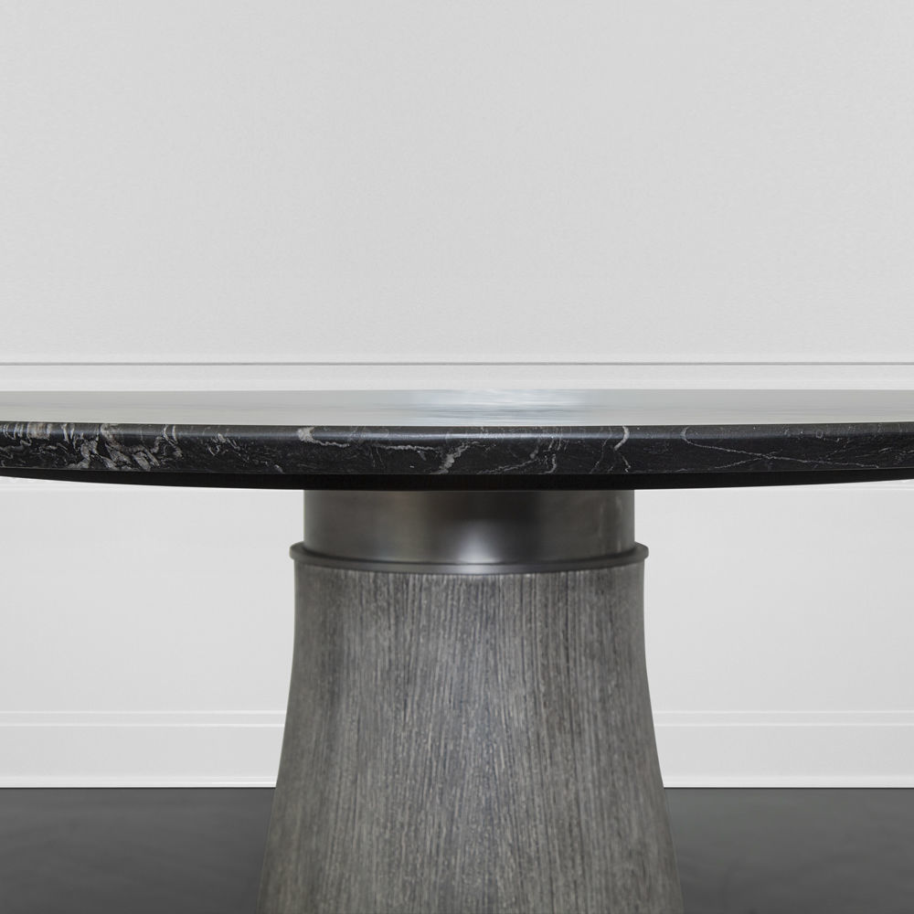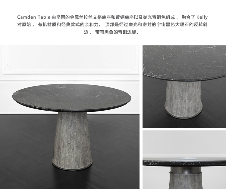 Camden Table由坚固的金属丝拉丝文格底座和黄铜底座以及抛光青铜色组成,融合了Kelly对原始,有机材质和经典款式的亲和力。 顶部是经过磨光和密封的宇宙黑色大理石的反转斜边,带有黑色的青铜边缘。 顶部还有白色Venatino石头和拉丝橡木。