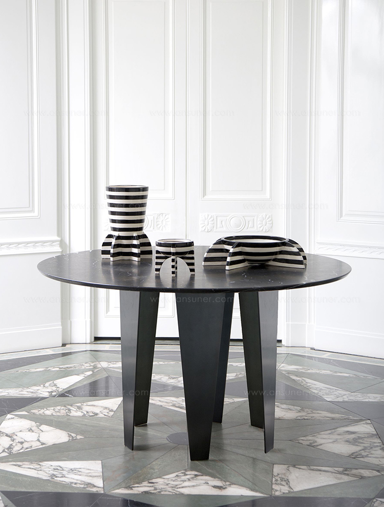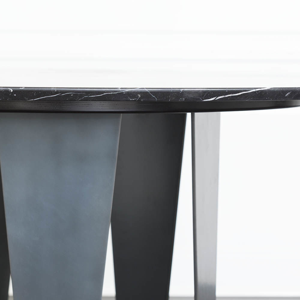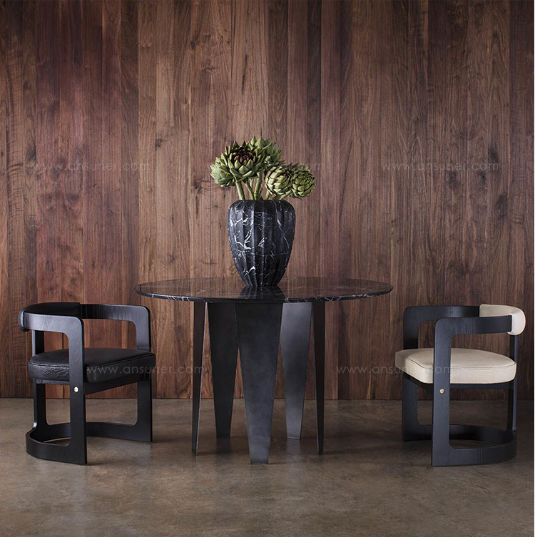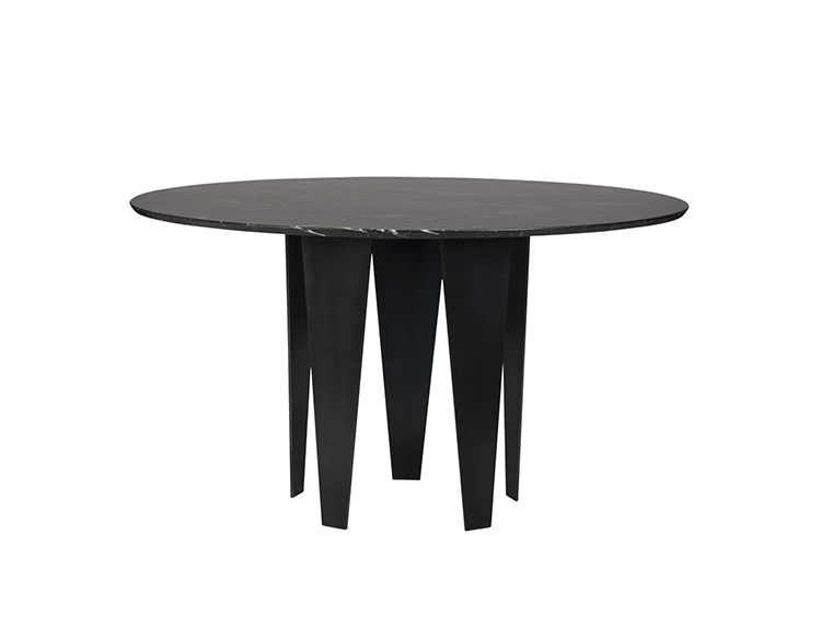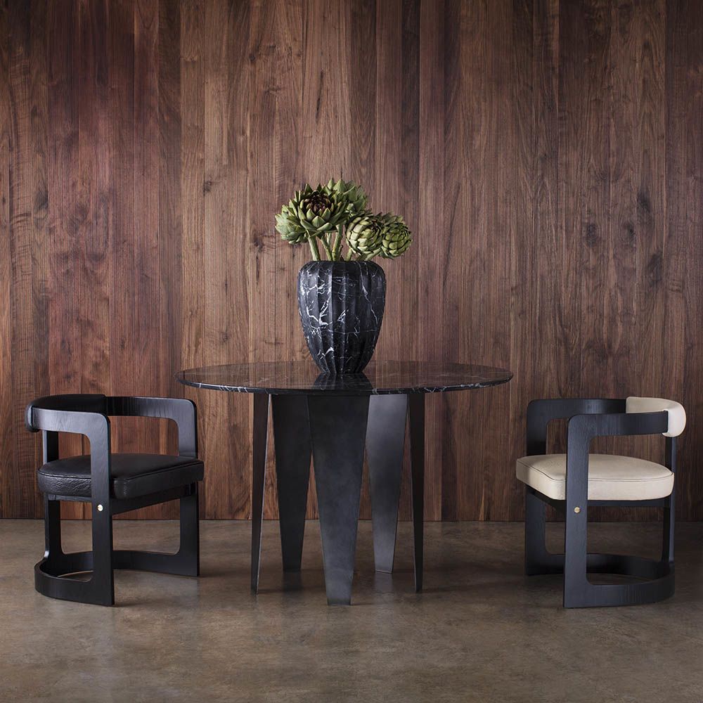 Grafton Dining Table(格拉夫顿餐桌)采用黑色钢质底座和黑色Marquina顶部磨砂密封大理石,并采用反向斜边细节构成,极为精致。 这种雕塑设计借鉴了凯利对几何形状的热爱以及对负空间的巧妙运用。