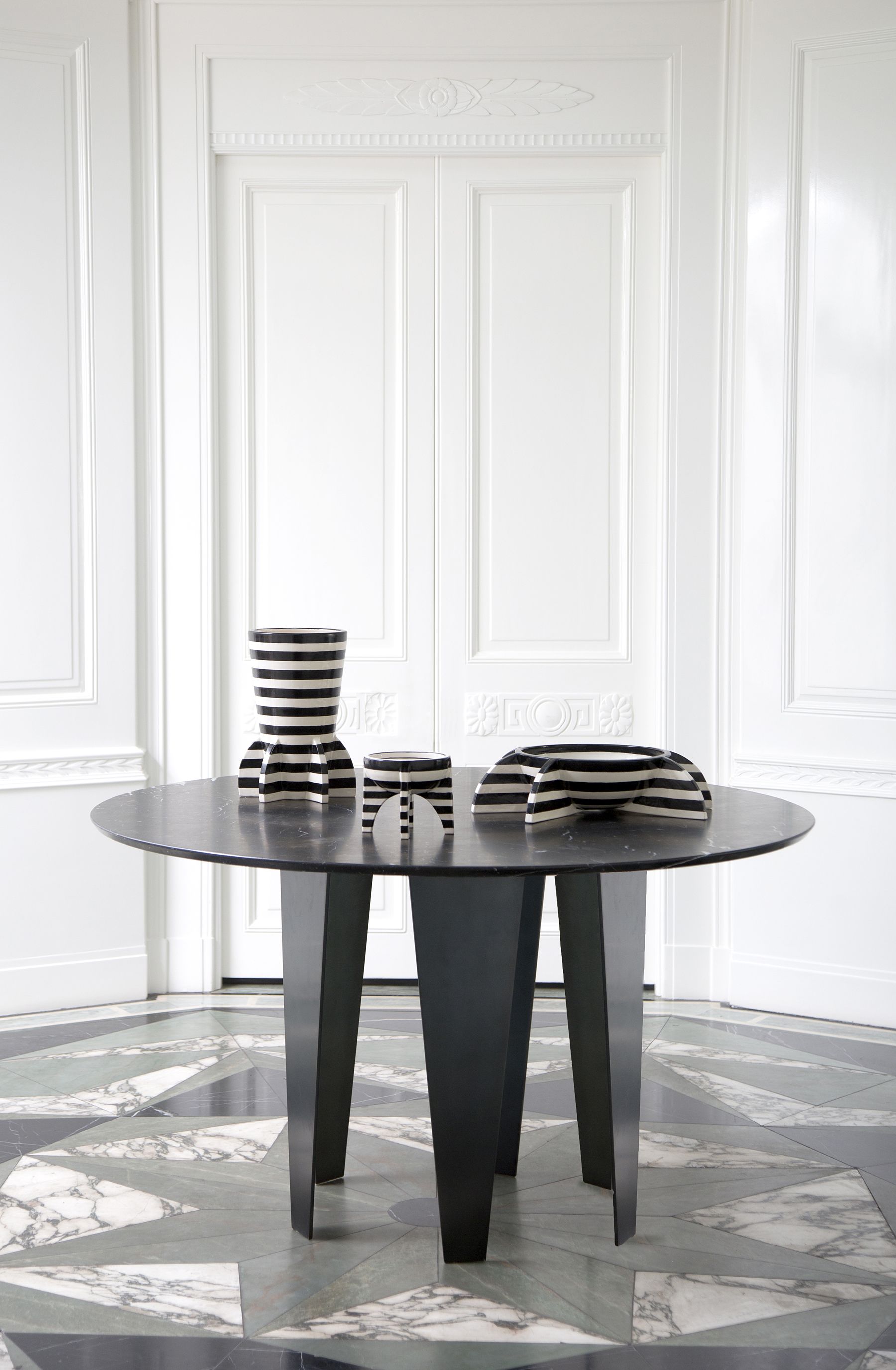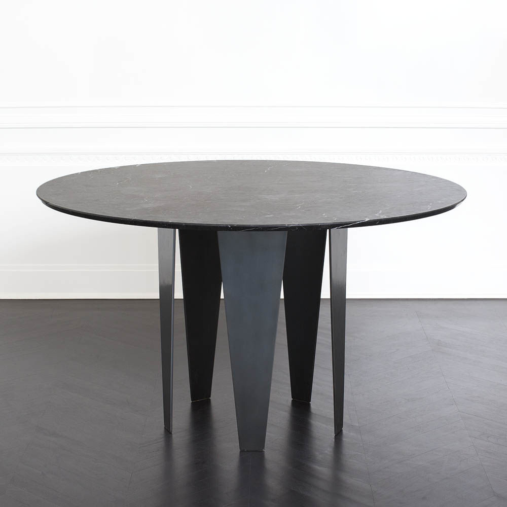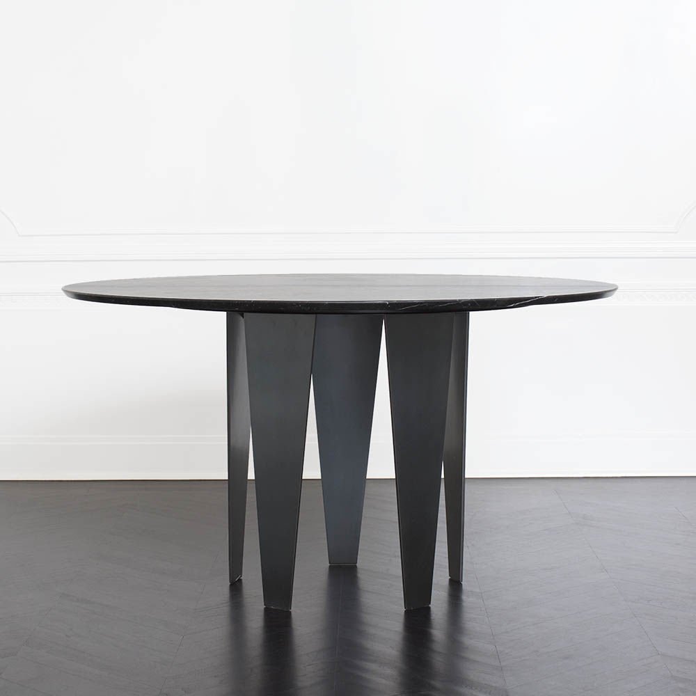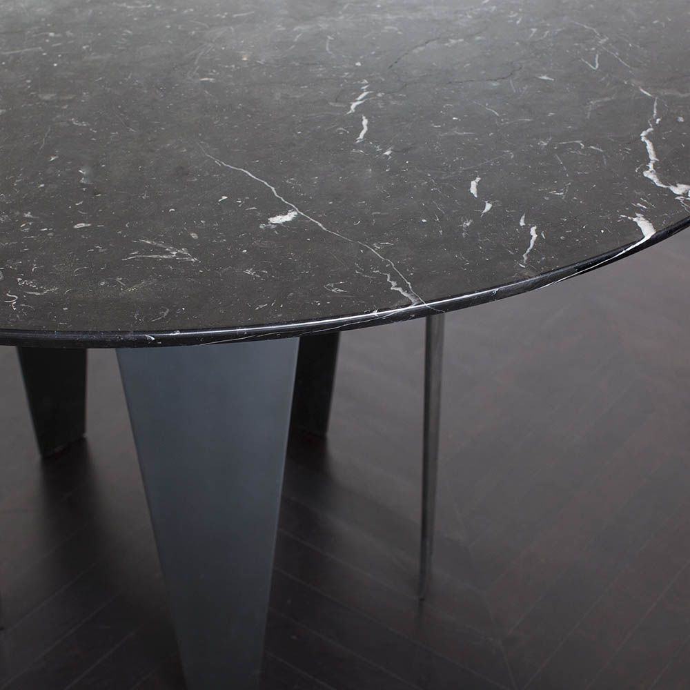 Grafton Dining Table(格拉夫顿餐桌)采用黑色钢质底座和黑色Marquina顶部磨砂密封大理石,并采用反向斜边细节构成,极为精致。 这种雕塑设计借鉴了凯利对几何形状的热爱以及对负空间的巧妙运用。