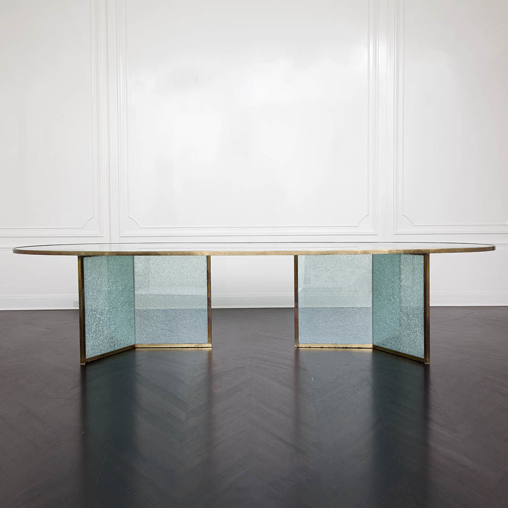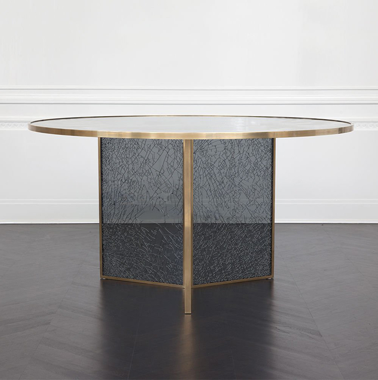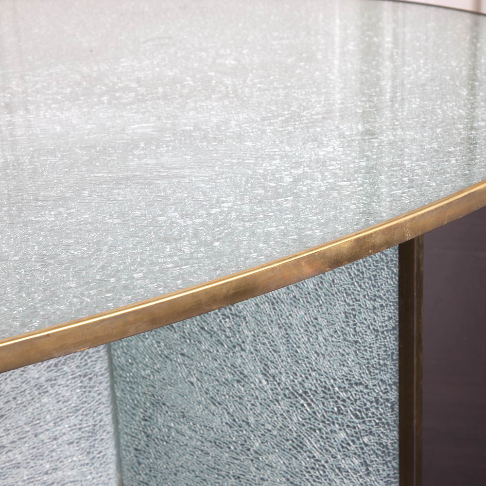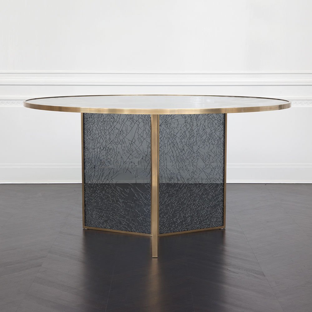 这款引人注目的现代餐桌拥有精美的纹理,融合了原始和精致的元素。 每块钢化玻璃都是手工破碎的,创造了材料的并置与优雅的古董黄铜封边条。