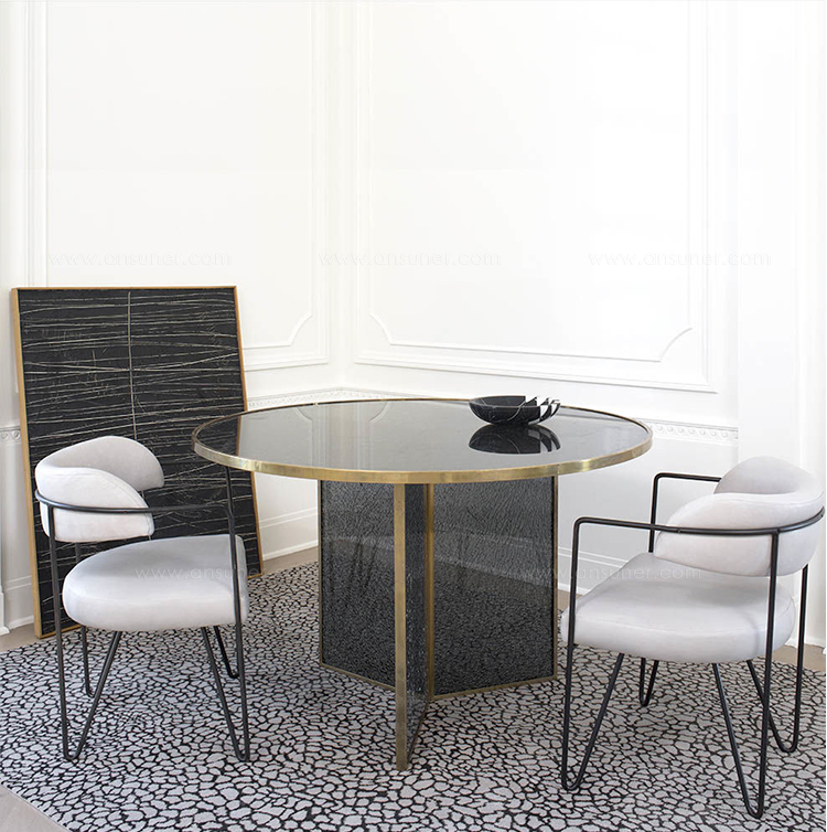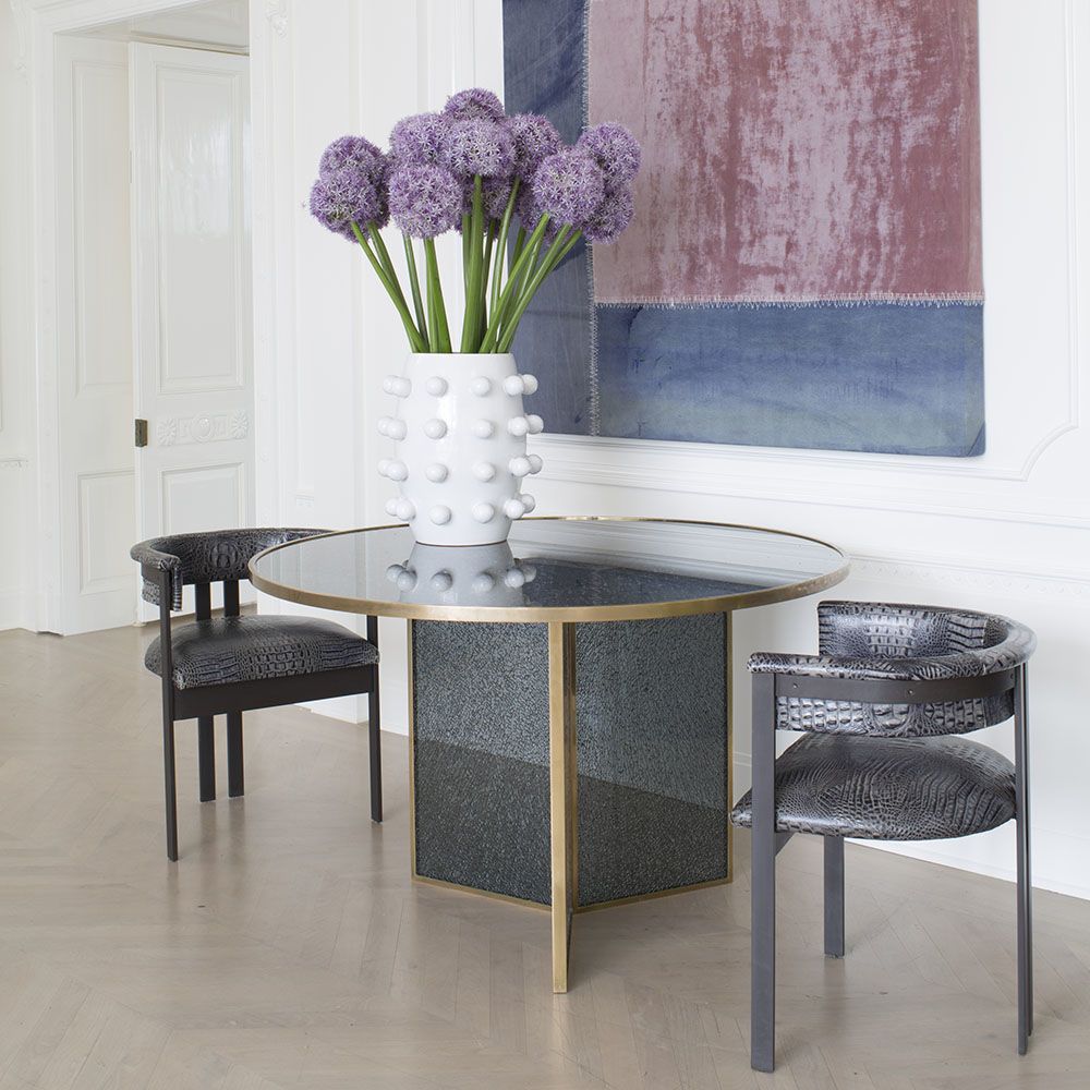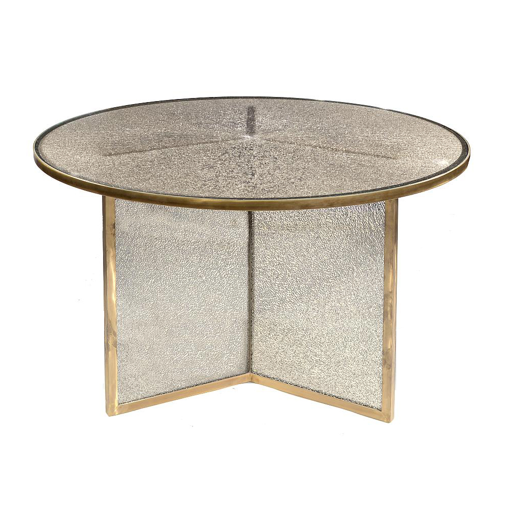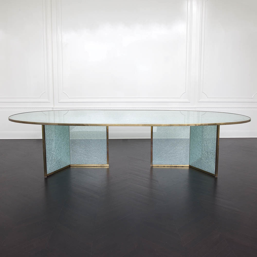 这款引人注目的现代餐桌拥有精美的纹理,融合了原始和精致的元素。 每块钢化玻璃都是手工破碎的,创造了材料的并置与优雅的古董黄铜封边条。