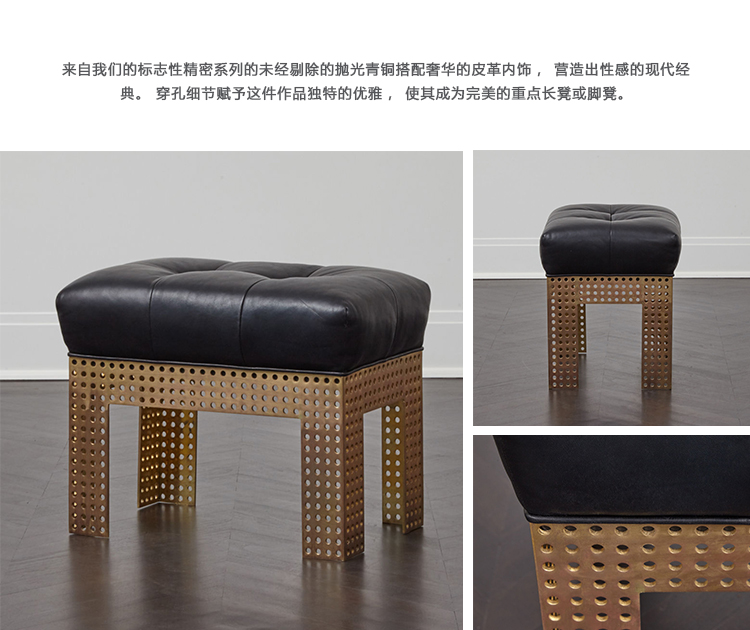来自我们的标志性精密系列的未经剔除的抛光青铜搭配奢华的皮革内饰,营造出性感的现代经典。 穿孔细节赋予这件作品独特的优雅,使其成为完美的重点长凳或脚凳。精密脚凳框架由天然青铜制,可以用各种不同的皮革或面料装饰。
