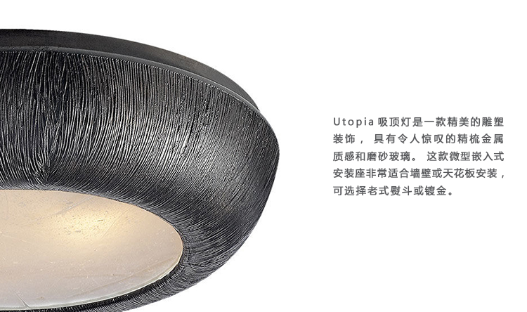 Utopia吸顶灯是一款精美的雕塑装饰,具有令人惊叹的精梳金属质感和磨砂玻璃。 这款非常适合墙壁或天花板安装,可选择老式熨斗或镀金。 适用于潮湿场所。