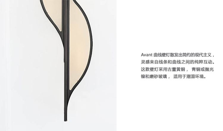 Avant曲线壁灯散发出简约的现代主义,灵感来自线条和曲线之间的纯粹互动。 这款壁灯采用古董黄铜,青铜或抛光镍和磨砂玻璃,适用于潮湿环境。