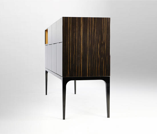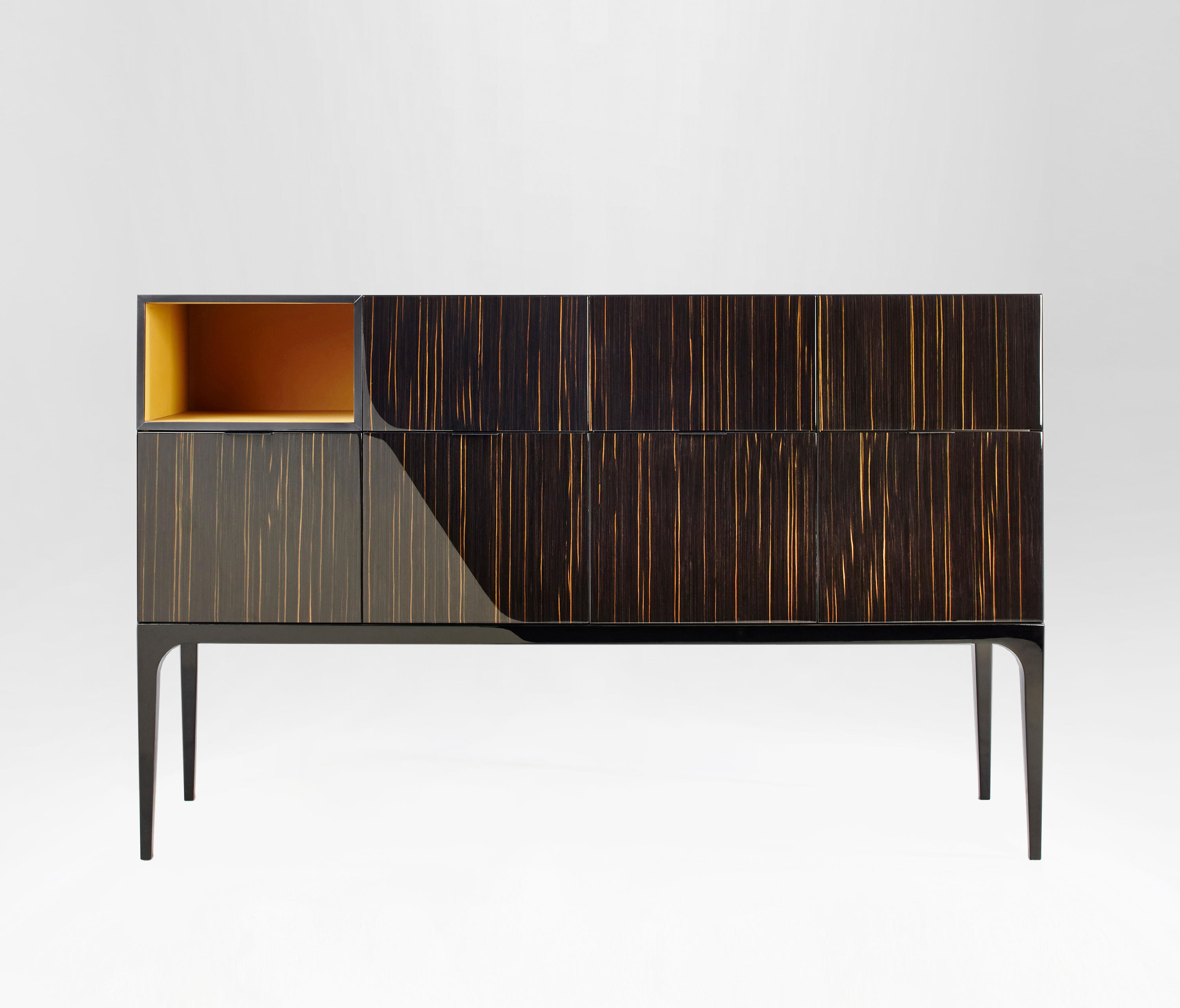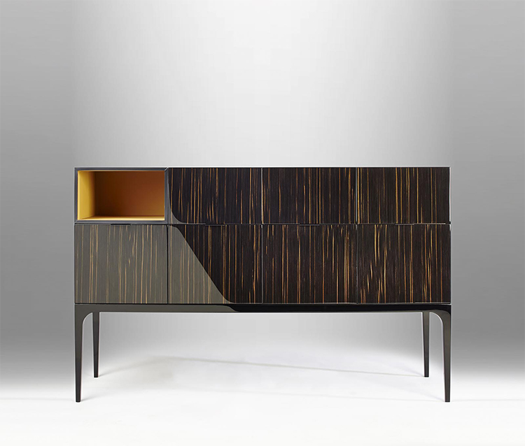 Madia由乌木制成,有七个抽屉和一个开放空间,支撑和镍镀锌金属框架。 利基用皮革覆盖。