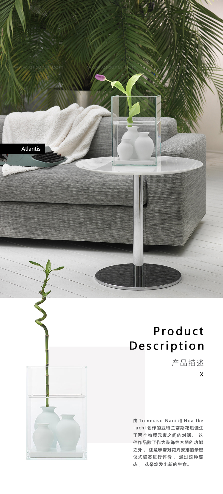 亚特兰蒂斯花瓶由一个玻璃盒组成,三个小的闪亮的白色釉面陶瓷花瓶浸没在其中:通过在花瓶中放置切花,创造了迷人的水生气氛,花朵在表面上诗意地升起。