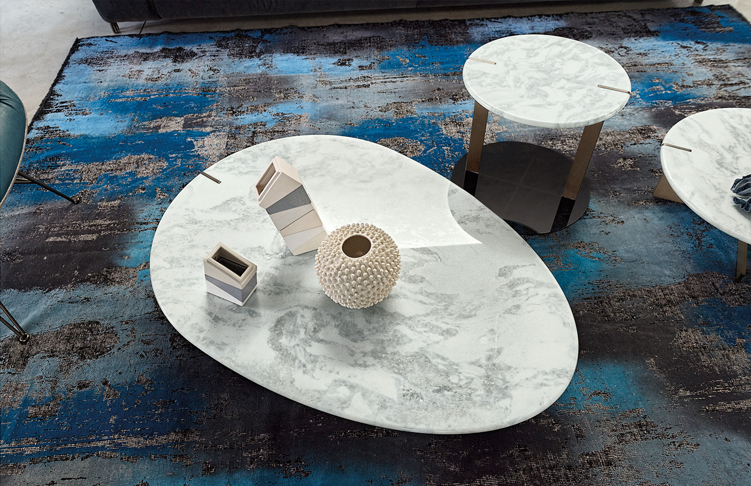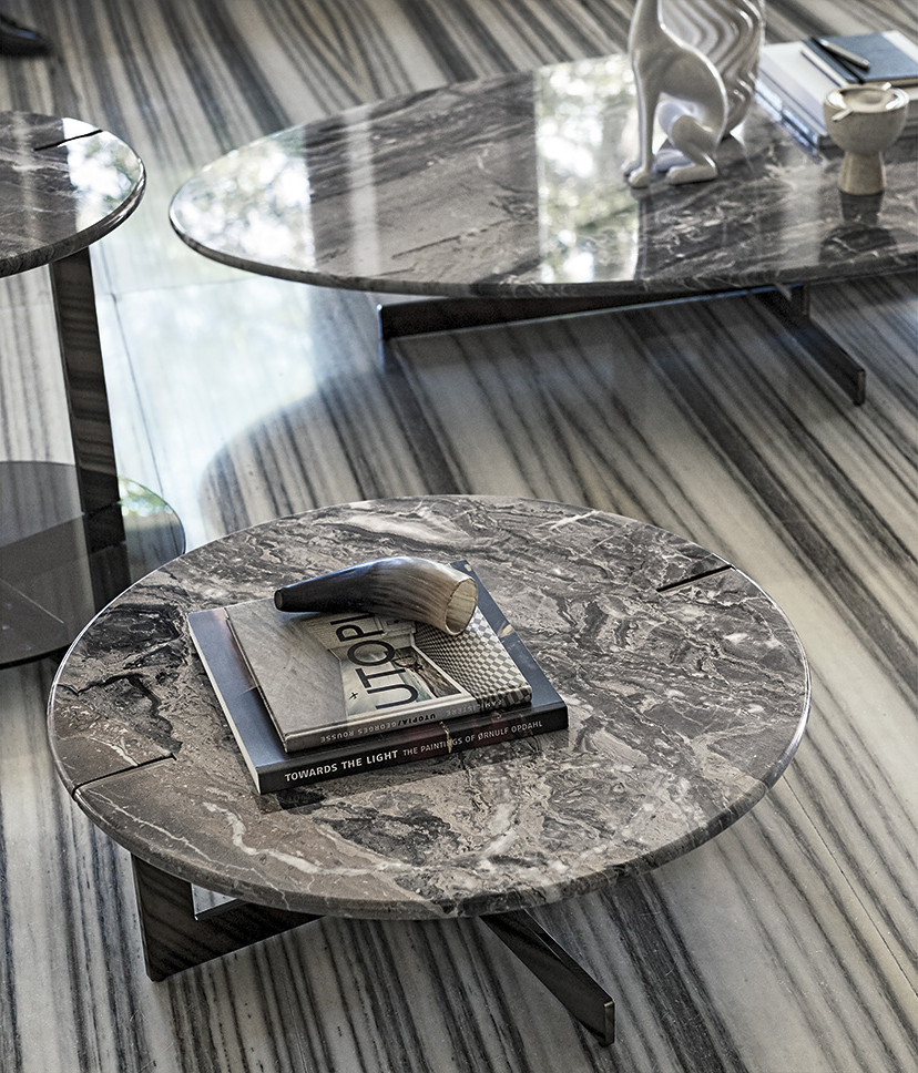 道格拉斯是一个由金属、大理石和玻璃组成的茶几系列。这些桌子可以围绕在沙发周围,因为它们可以放在前面、后面或侧面,可以用作茶几或边几。