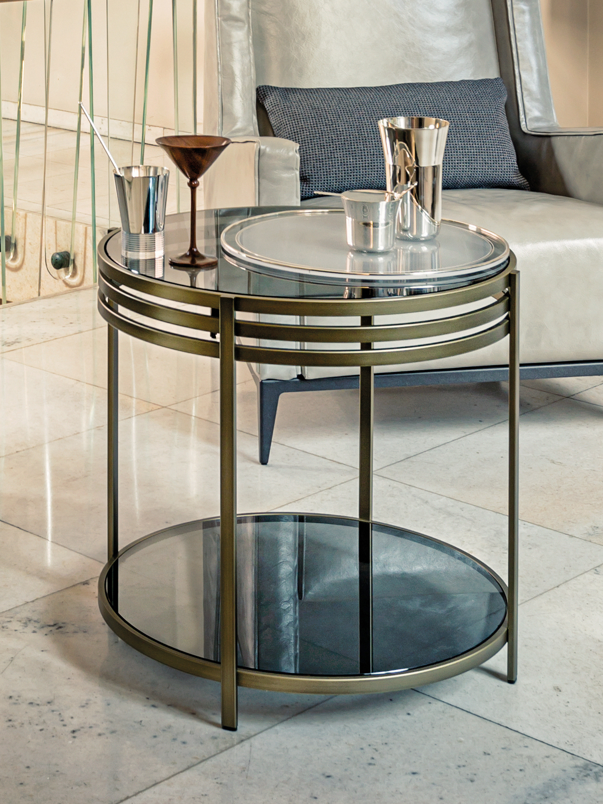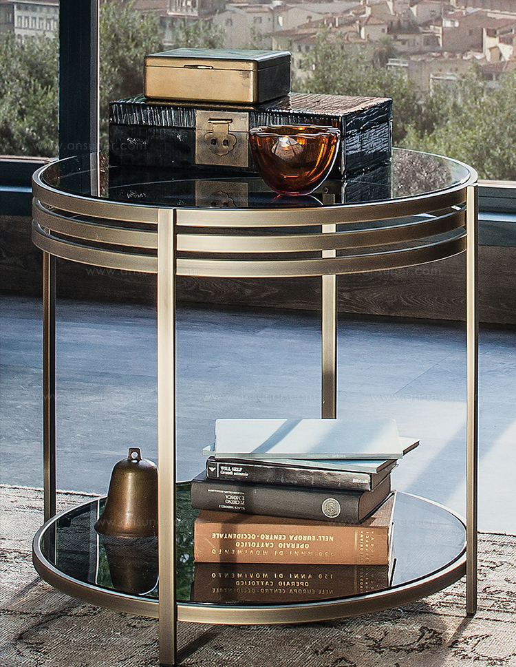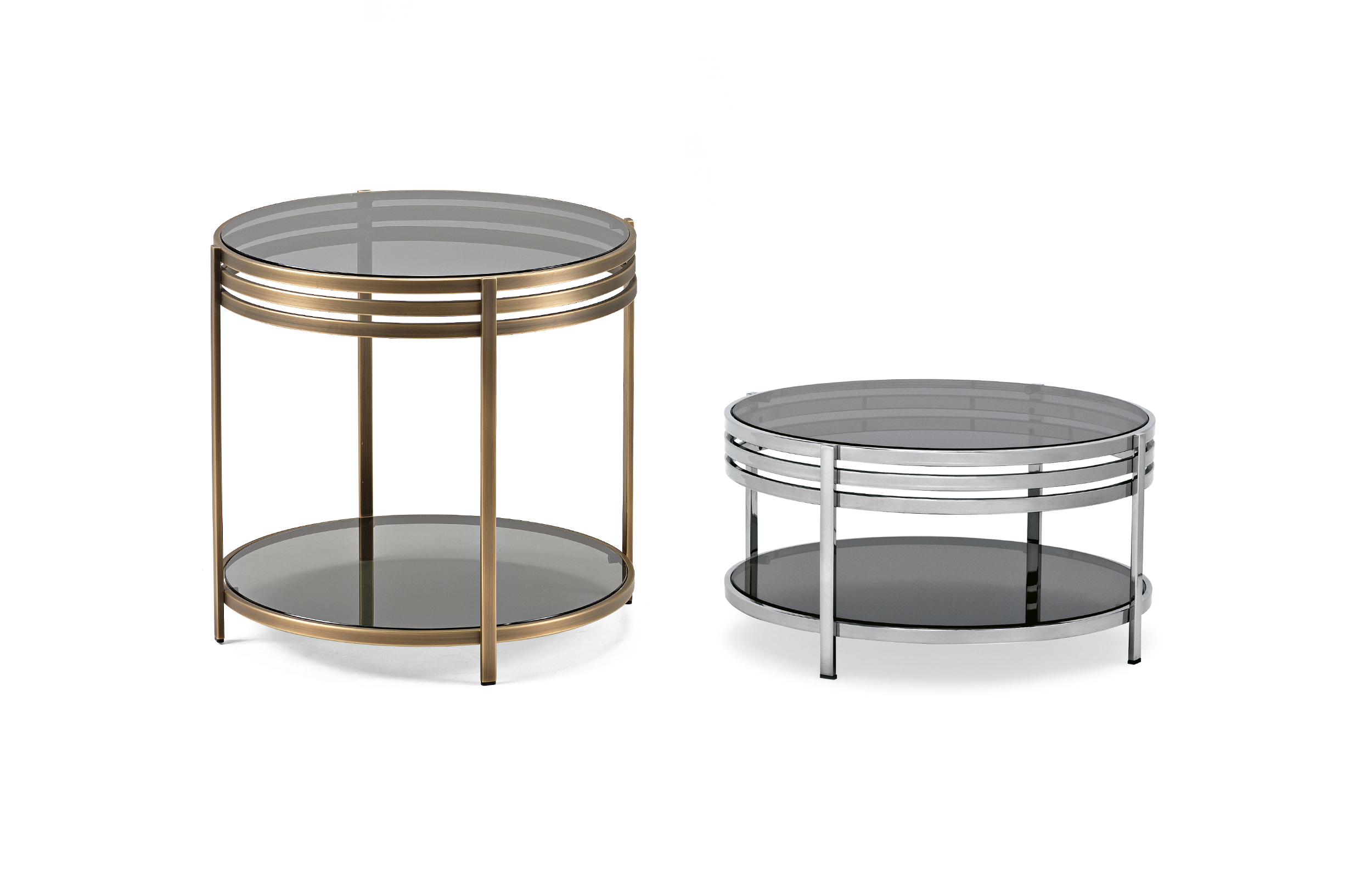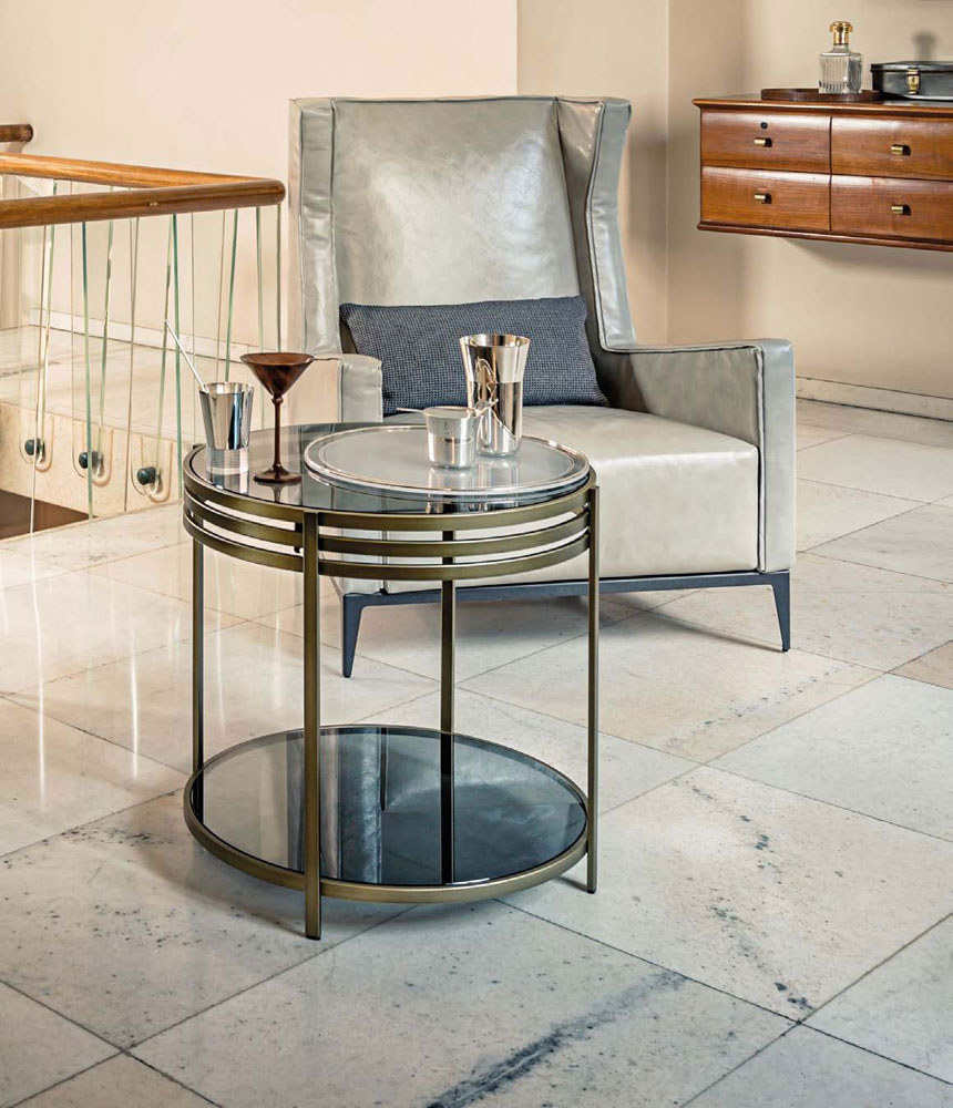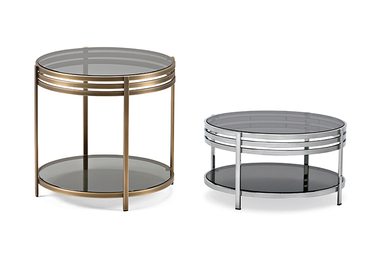 一系列的小桌子,突出了优雅的结构,用抛光的不锈钢或黄铜制成,并以温和的烟熏玻璃为顶部。