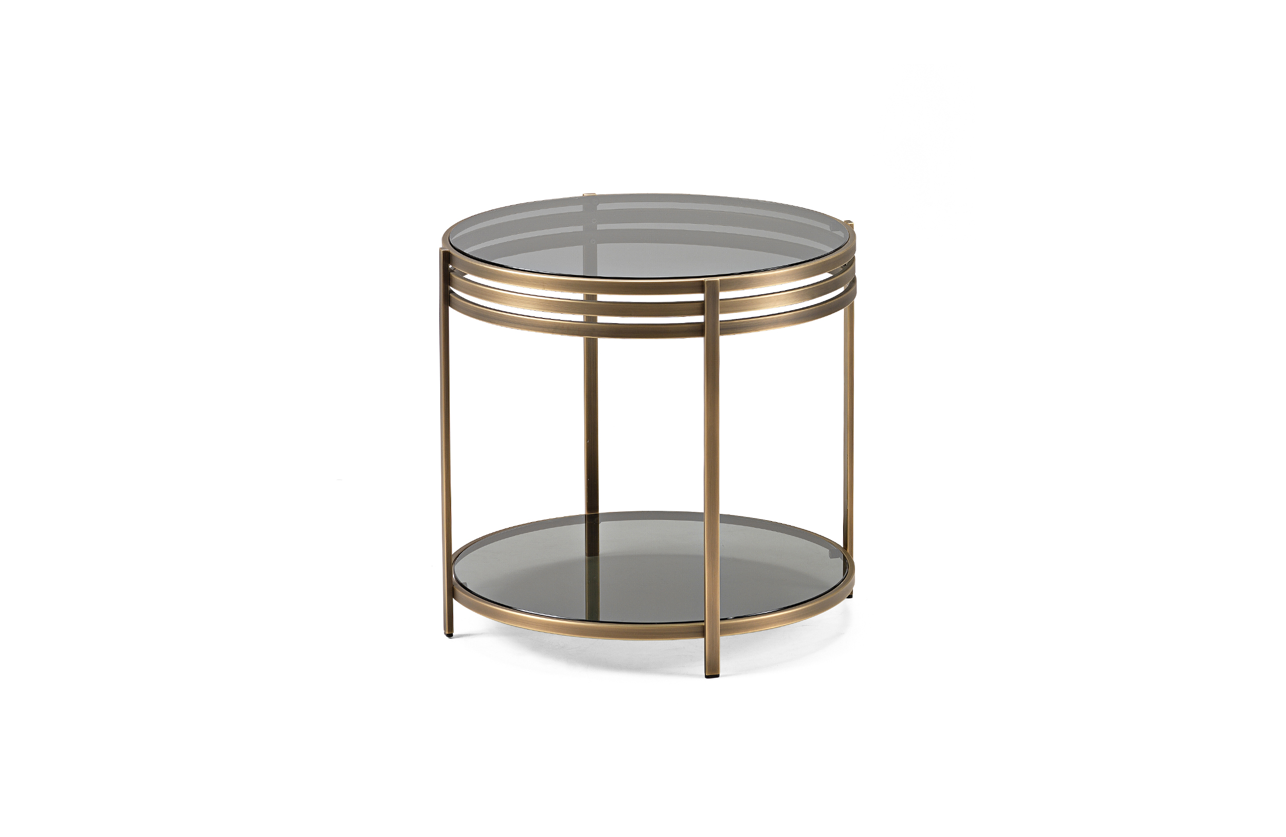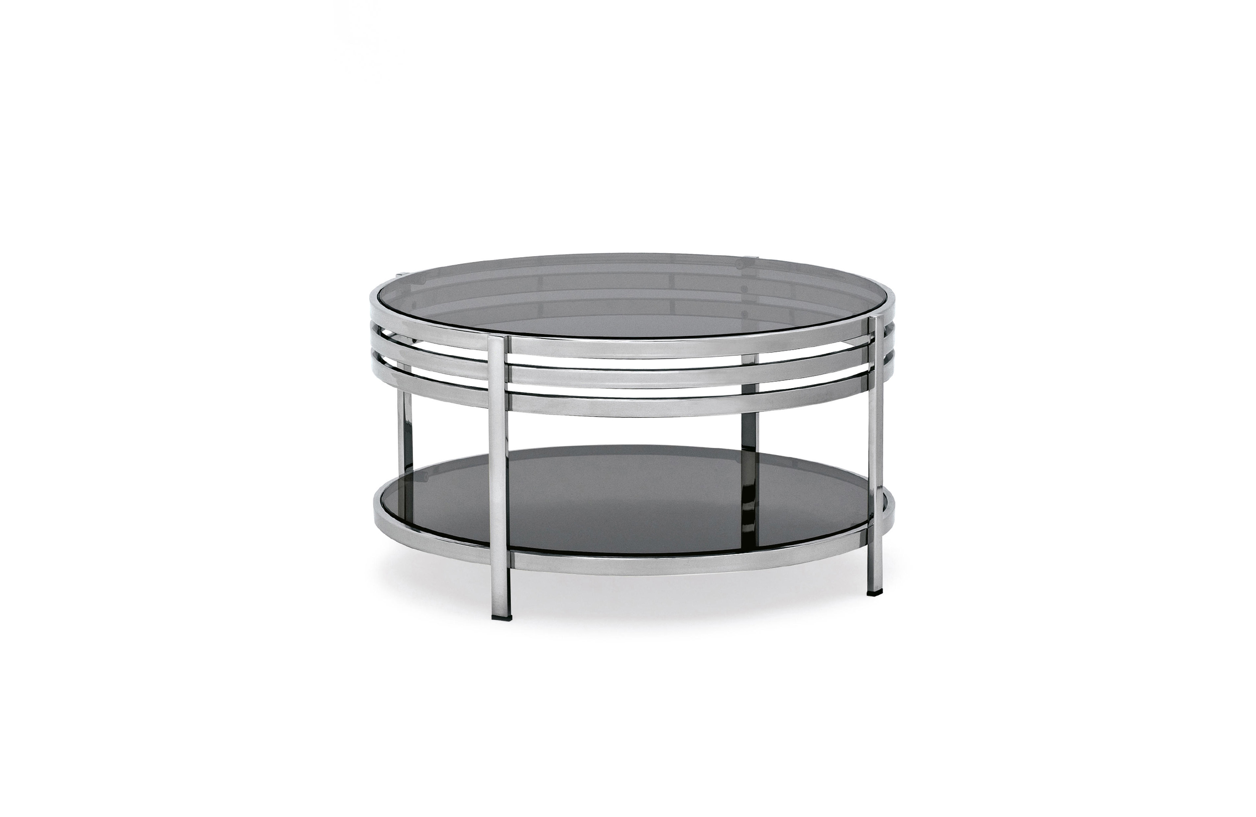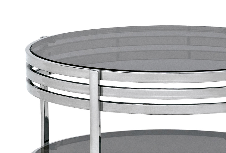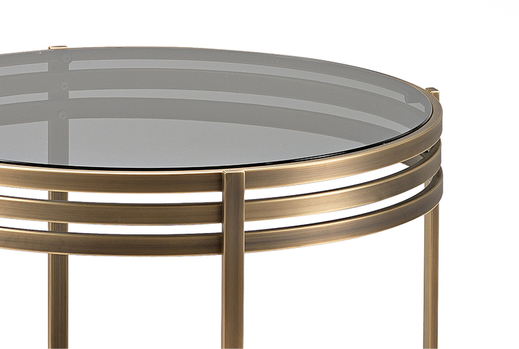 一系列的小桌子,突出了优雅的结构,用抛光的不锈钢或黄铜制成,并以温和的烟熏玻璃为顶部。