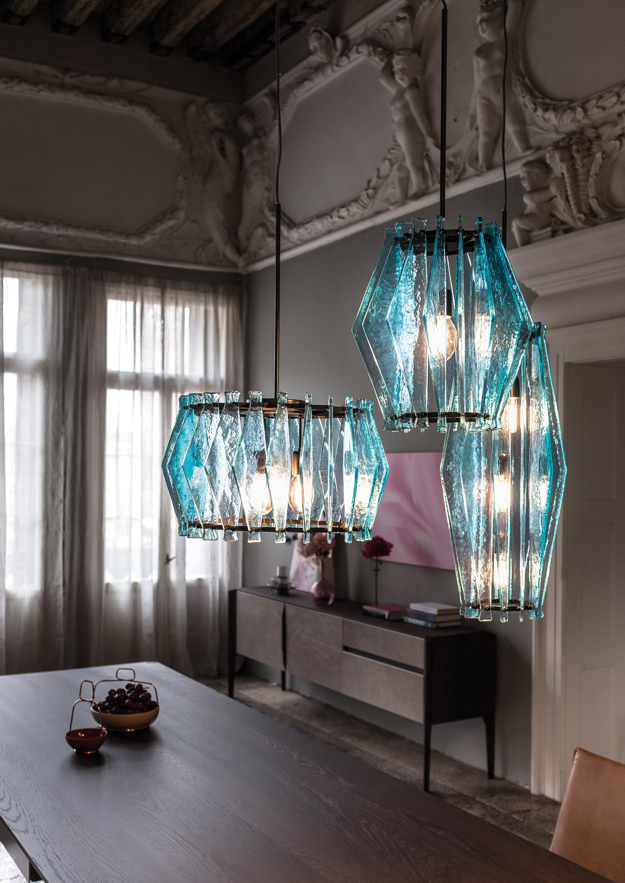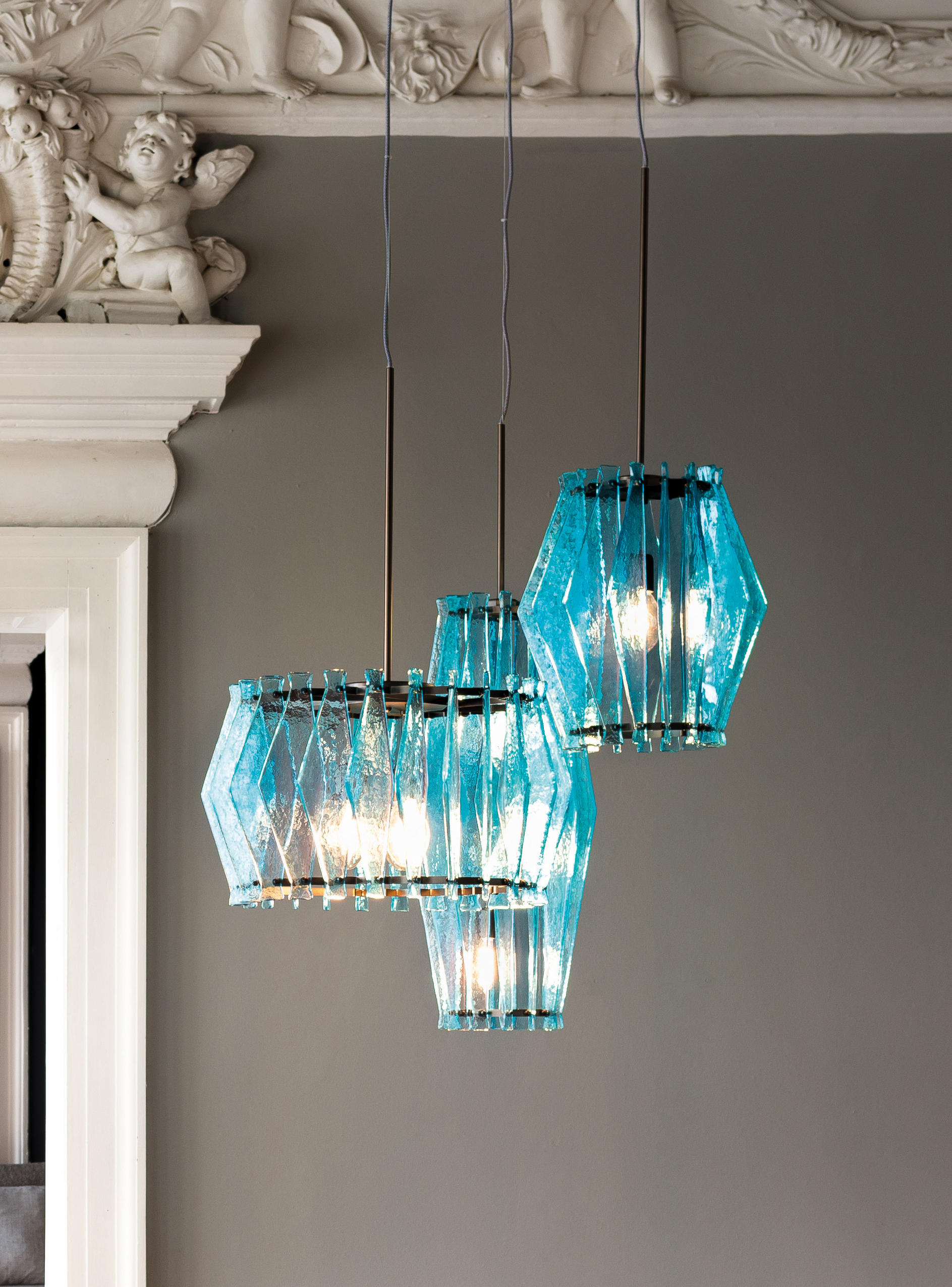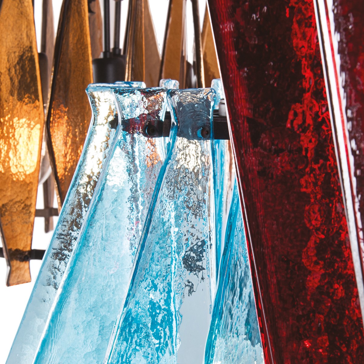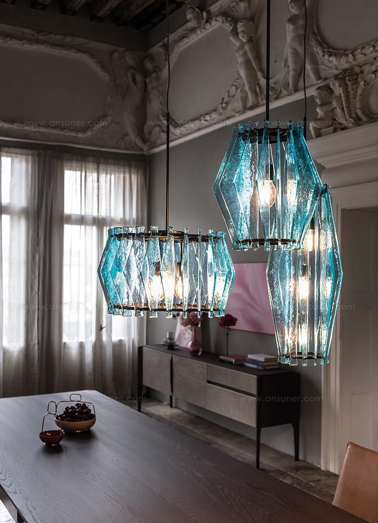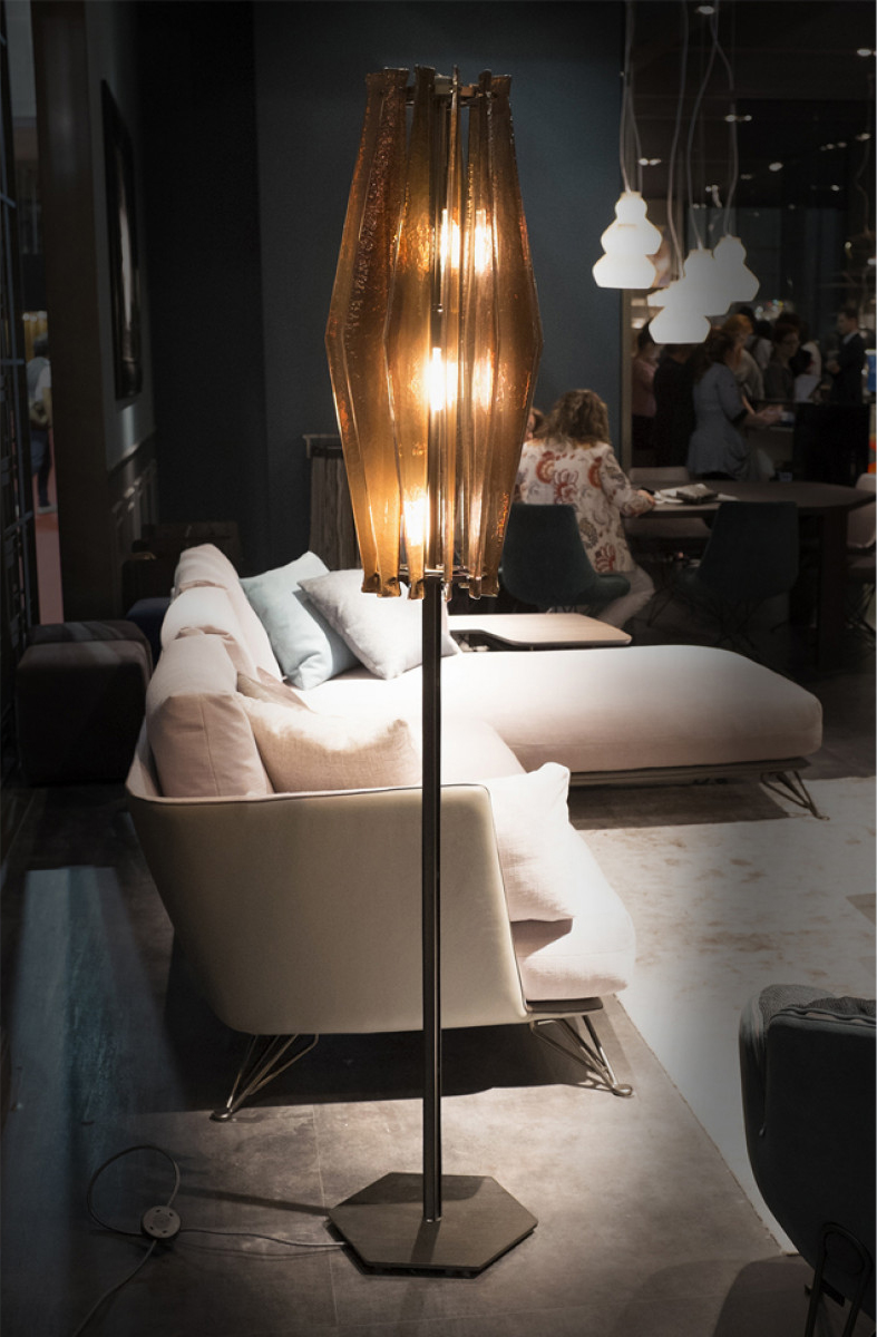 oompa-loompa灯的特点是有几条带着径向定位的带斑点的玻璃,就像许多小型的“oompa-loompas”正在跳舞一样。光线透过玻璃和空的空间扩散,创造出几束光线,营造出壮观的环境。该系列包括一个悬挂的版本,有青铜色、蓝绿色和红宝石色三种不同颜色;和一盏落地灯。金属部分是云母棕色的钛。