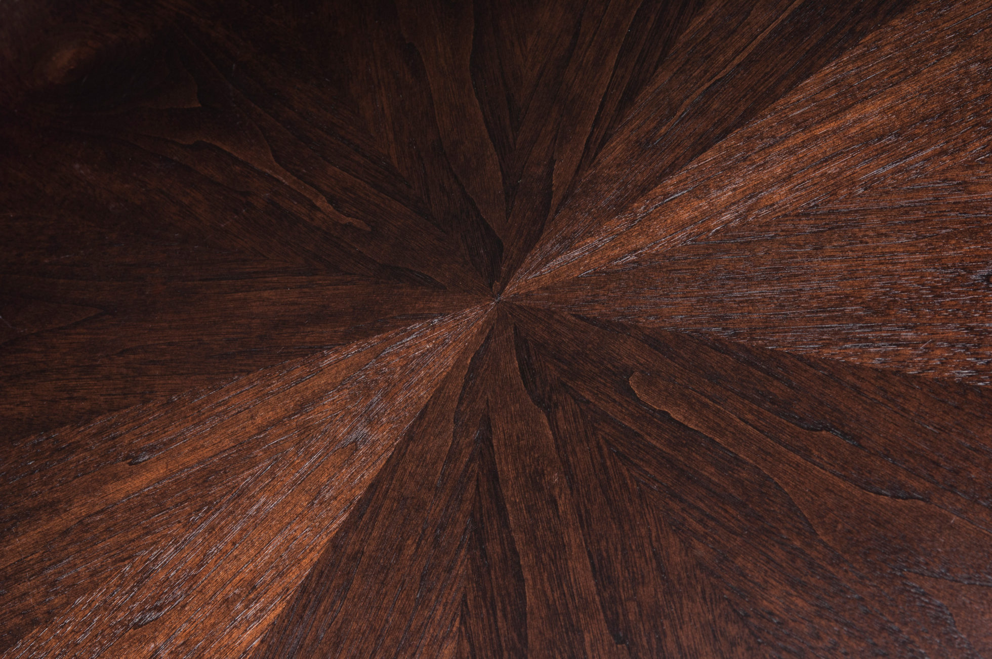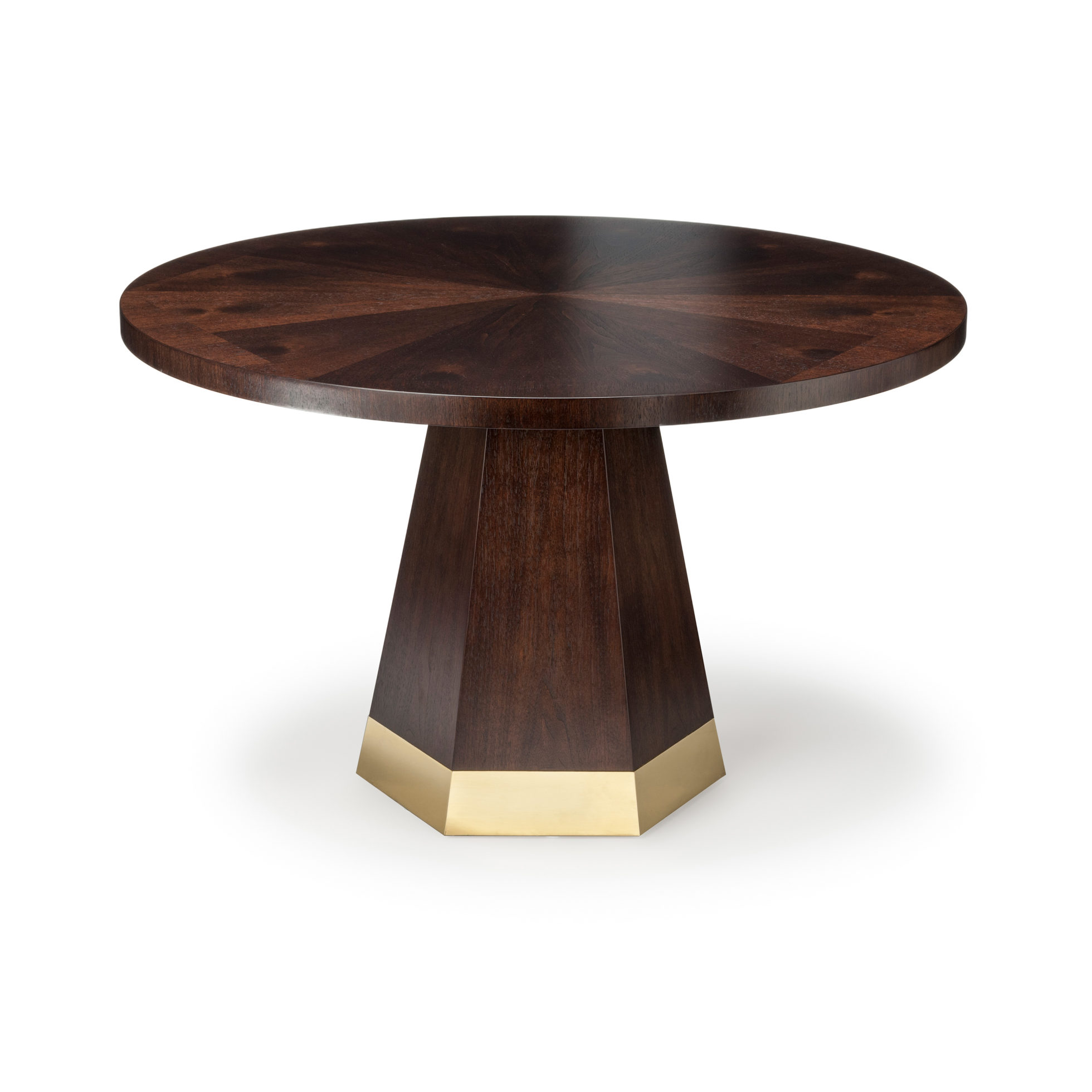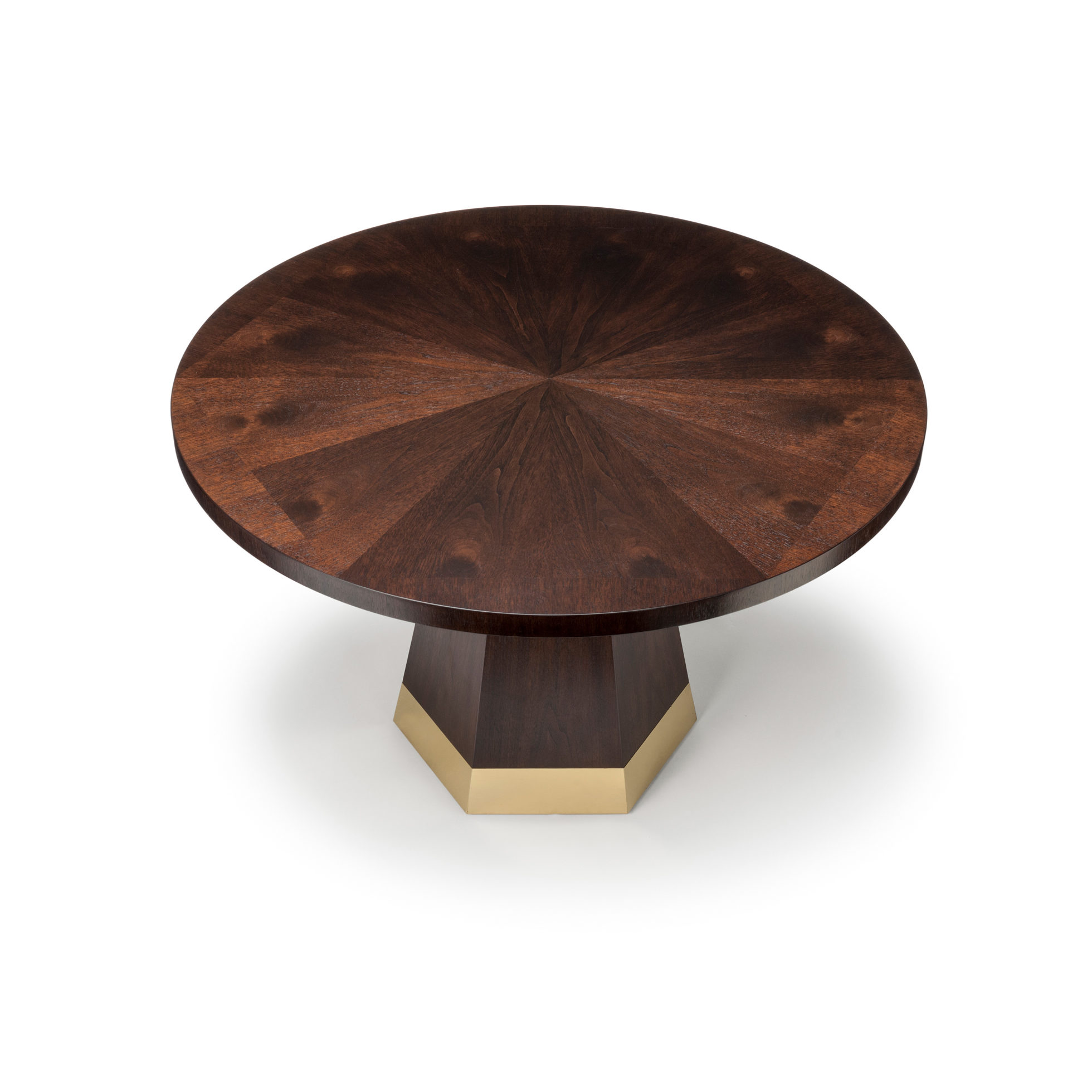 中心针茶几,圆形桌面和圆锥形六角棱柱底座。 桌面有六个部分,钻石单板匹配,产生径向效果。