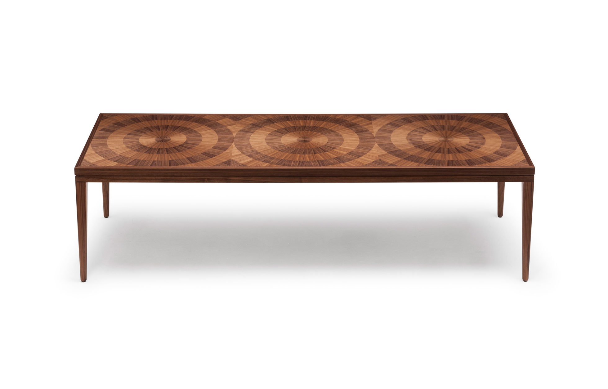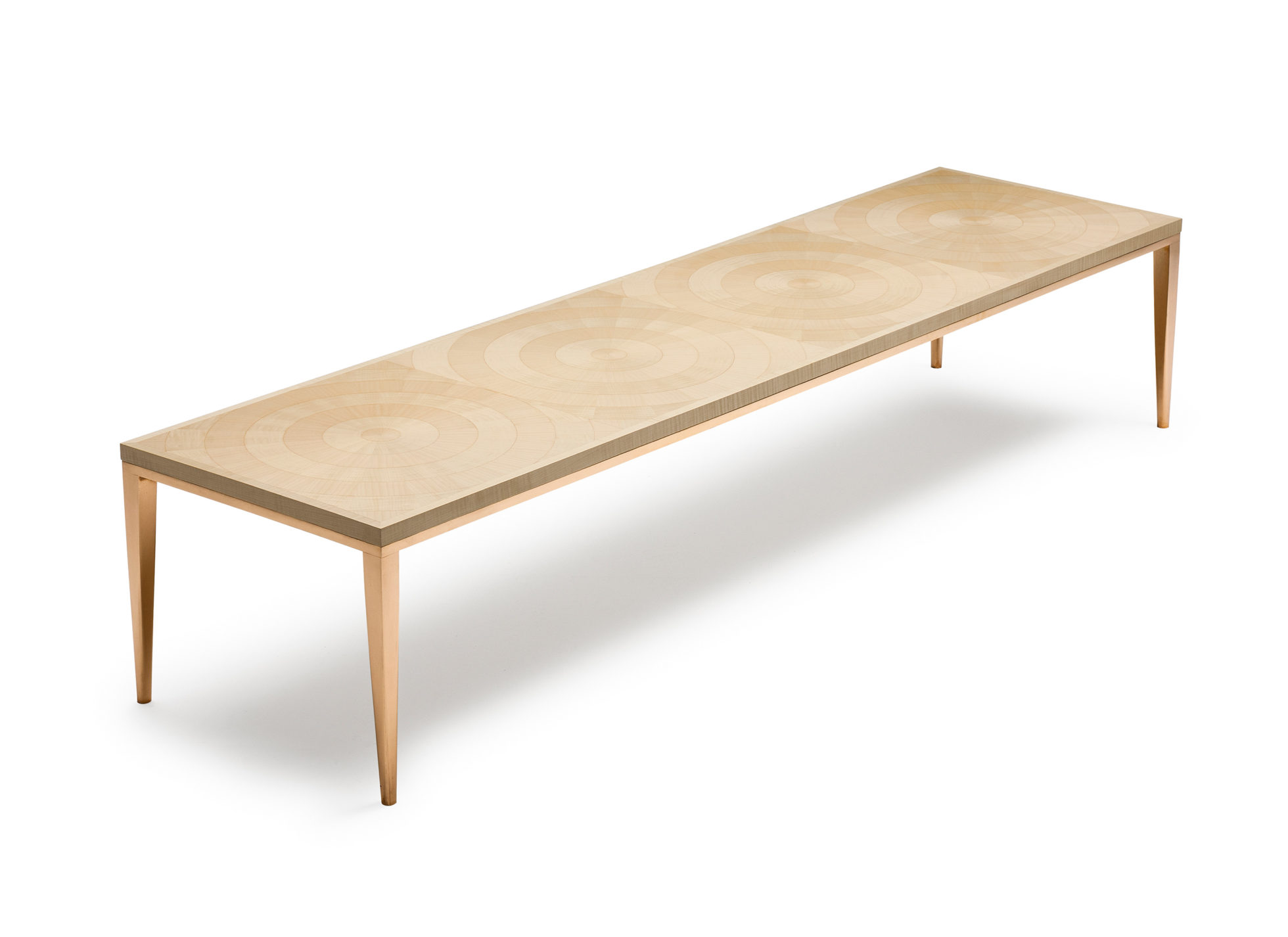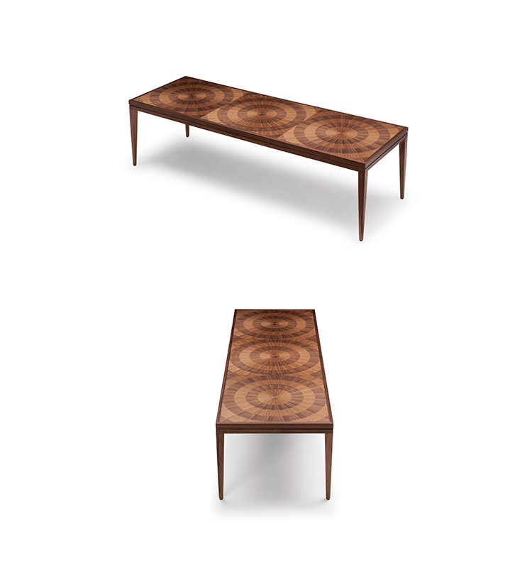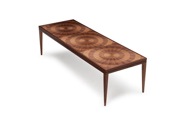 手工铺设的径向同心圆形对比色调和美国梧桐切割在坚实的抛光青铜腿上,这款特别版的Catalyst咖啡桌远远望去,而坐在附近则是错综复杂的美丽。