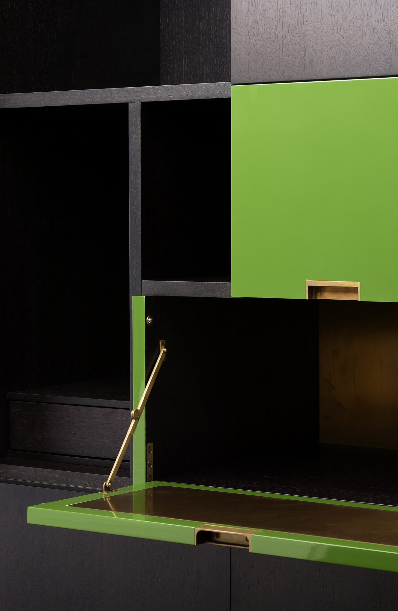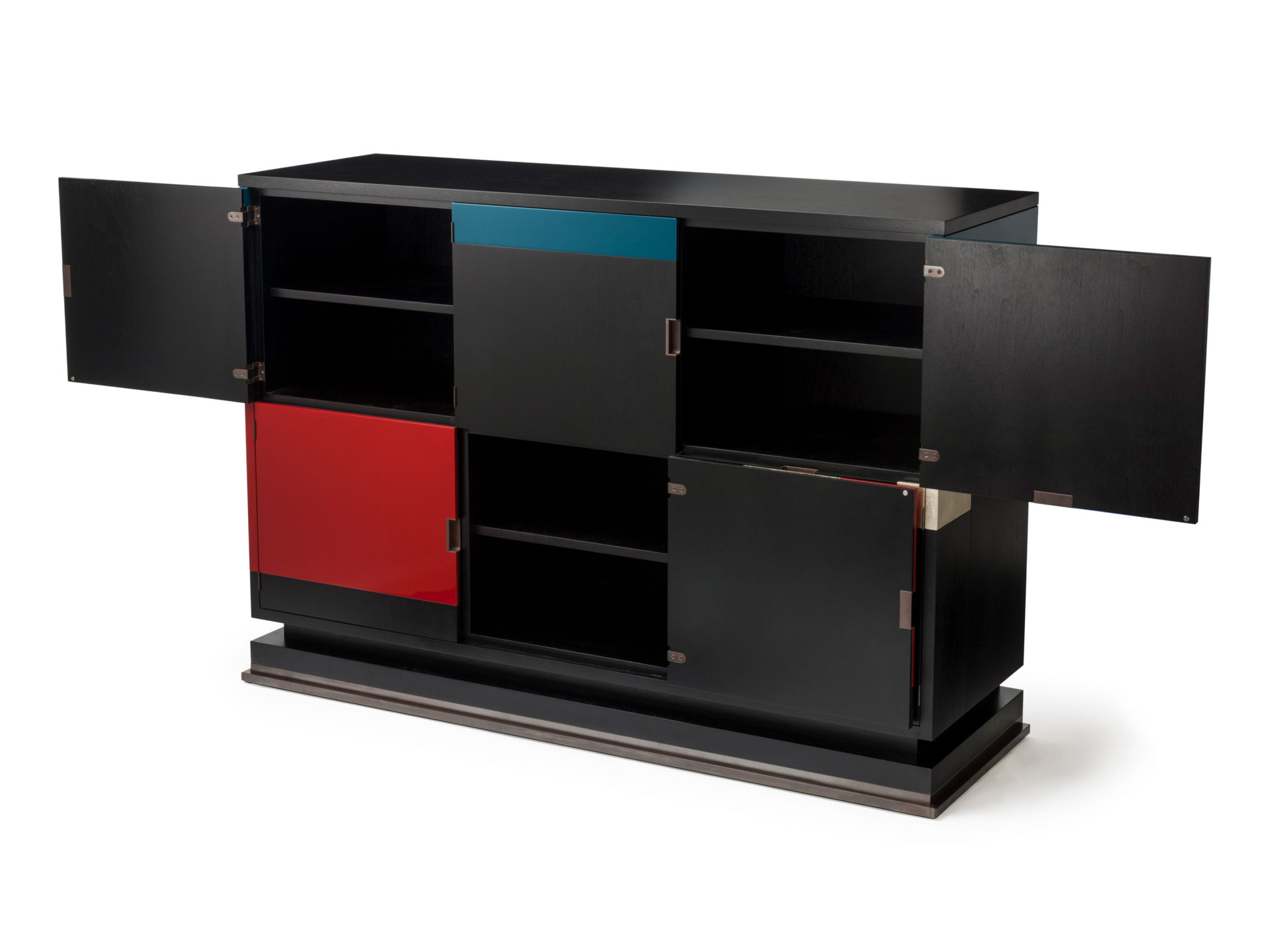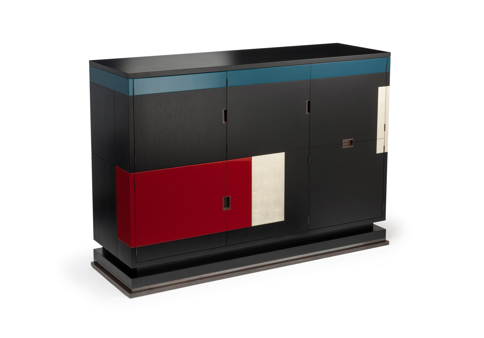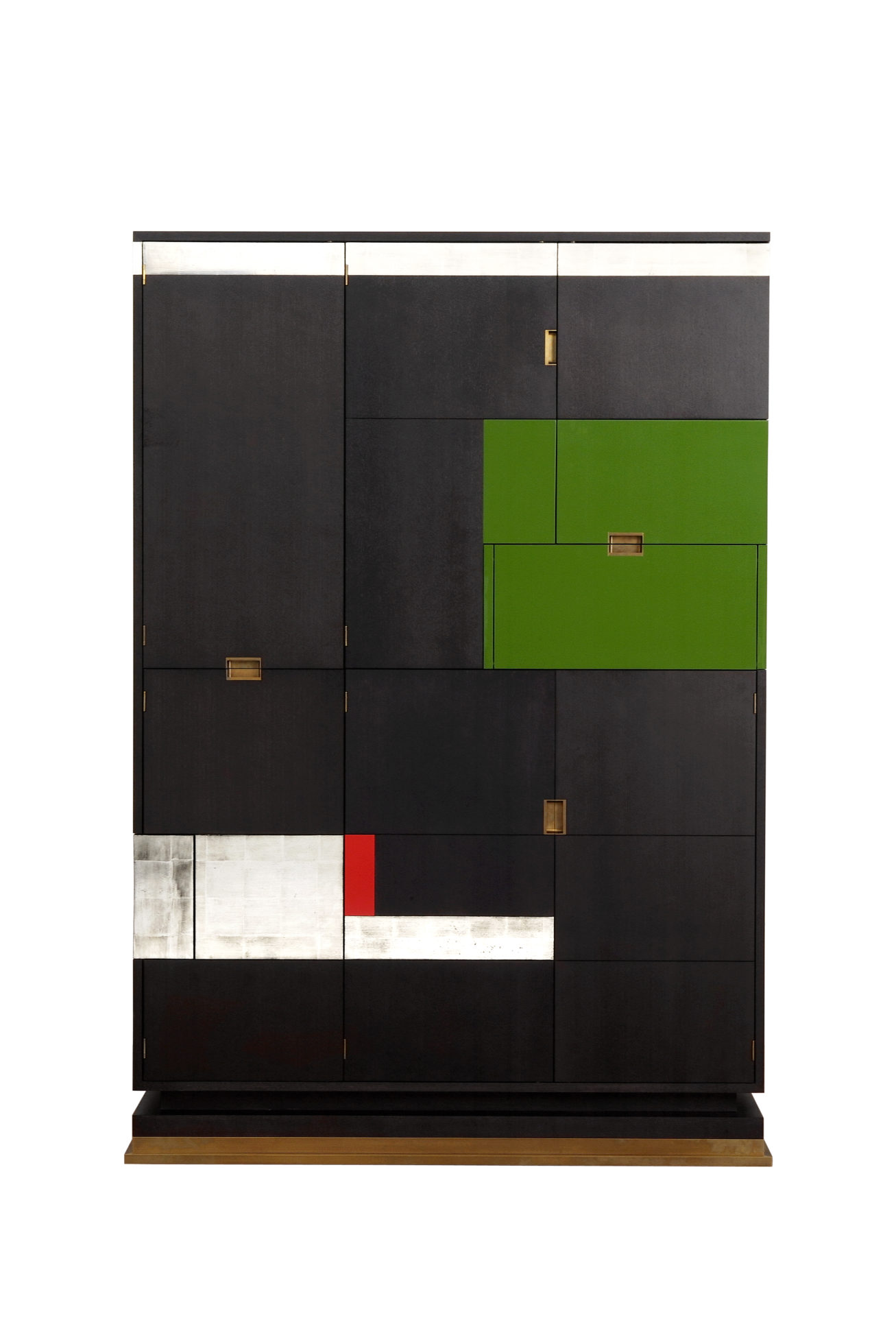 美式黑胡桃黑色饮料柜,带多个抽屉和门。 高光红色和绿色漆,白金叶和黄铜色的细节。 内置橱柜门定制手柄和实心黄铜铰链。 最好的杂技橱柜制作。