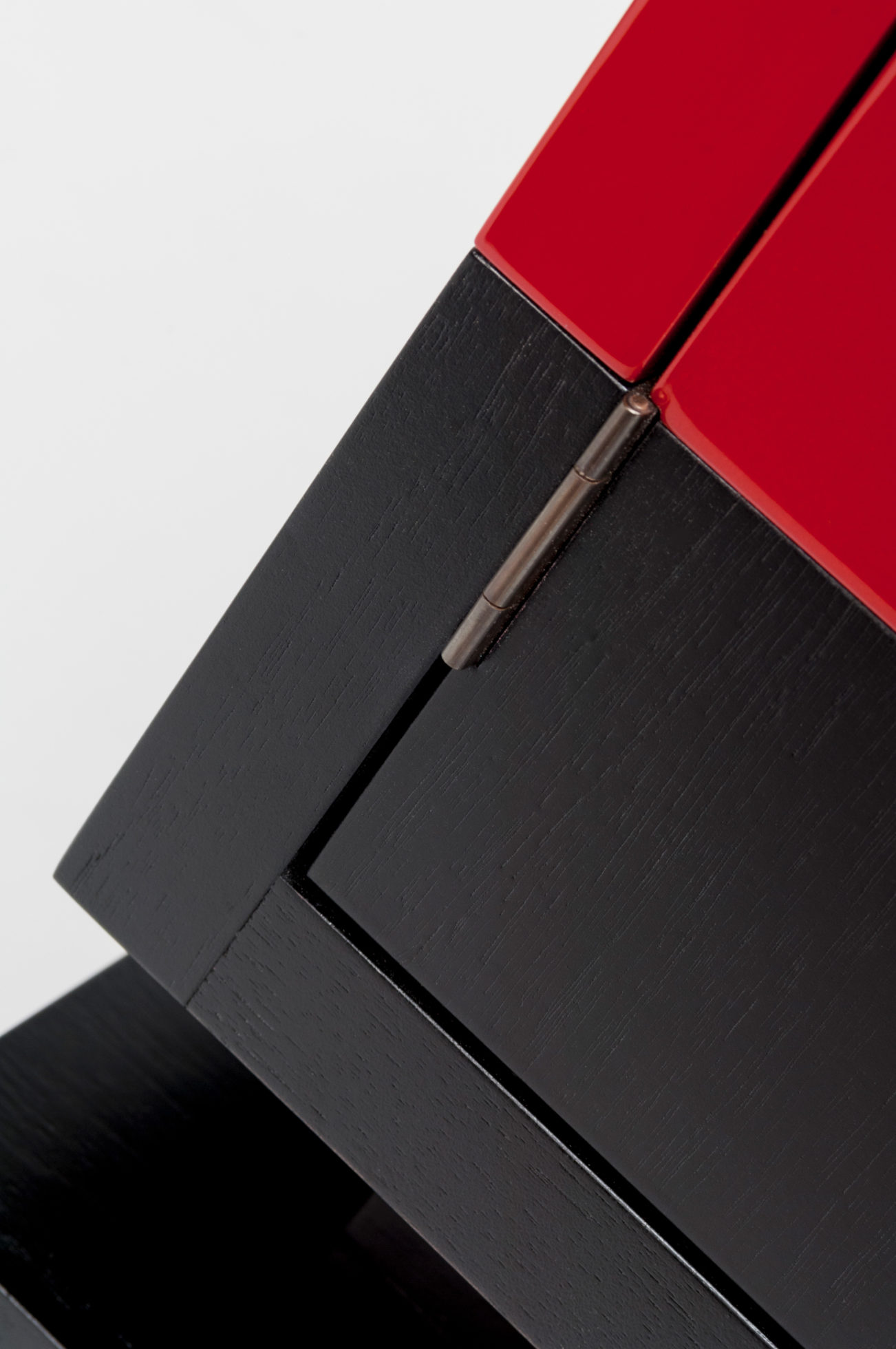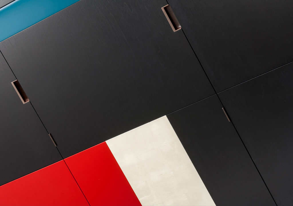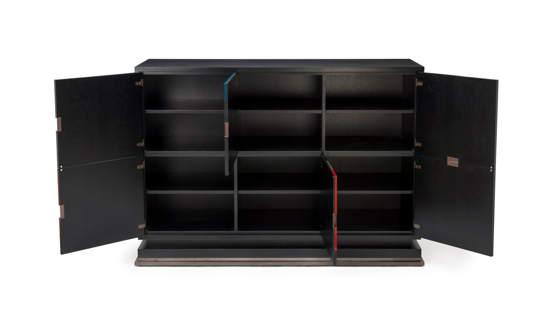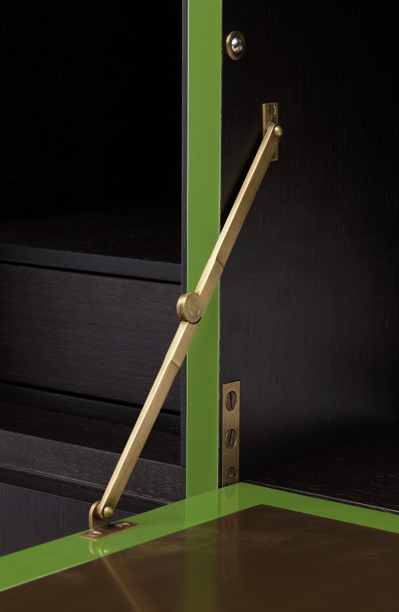 美式黑胡桃黑色饮料柜,带多个抽屉和门。 高光红色和绿色漆,白金叶和黄铜色的细节。 内置橱柜门定制手柄和实心黄铜铰链。 最好的杂技橱柜制作。