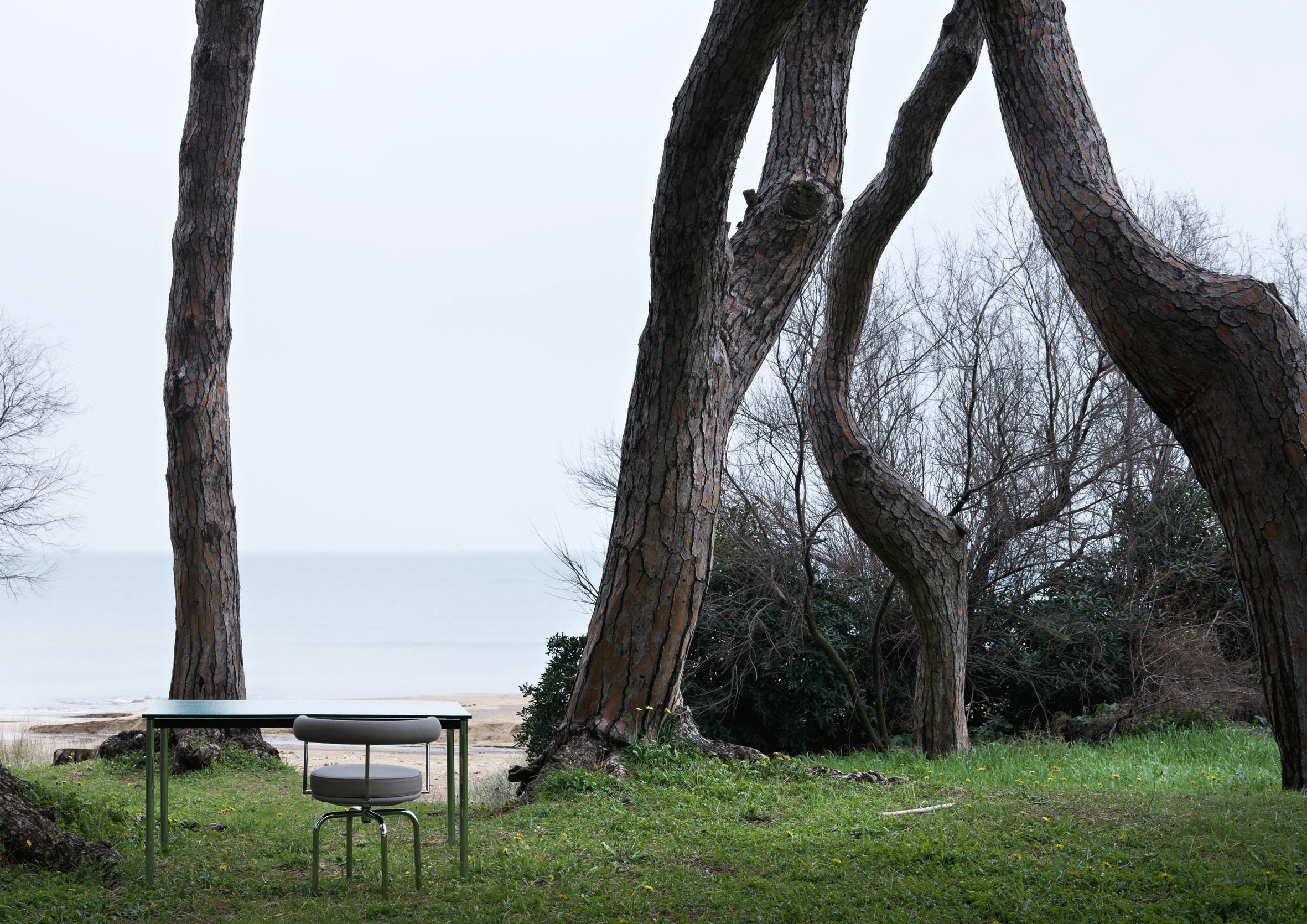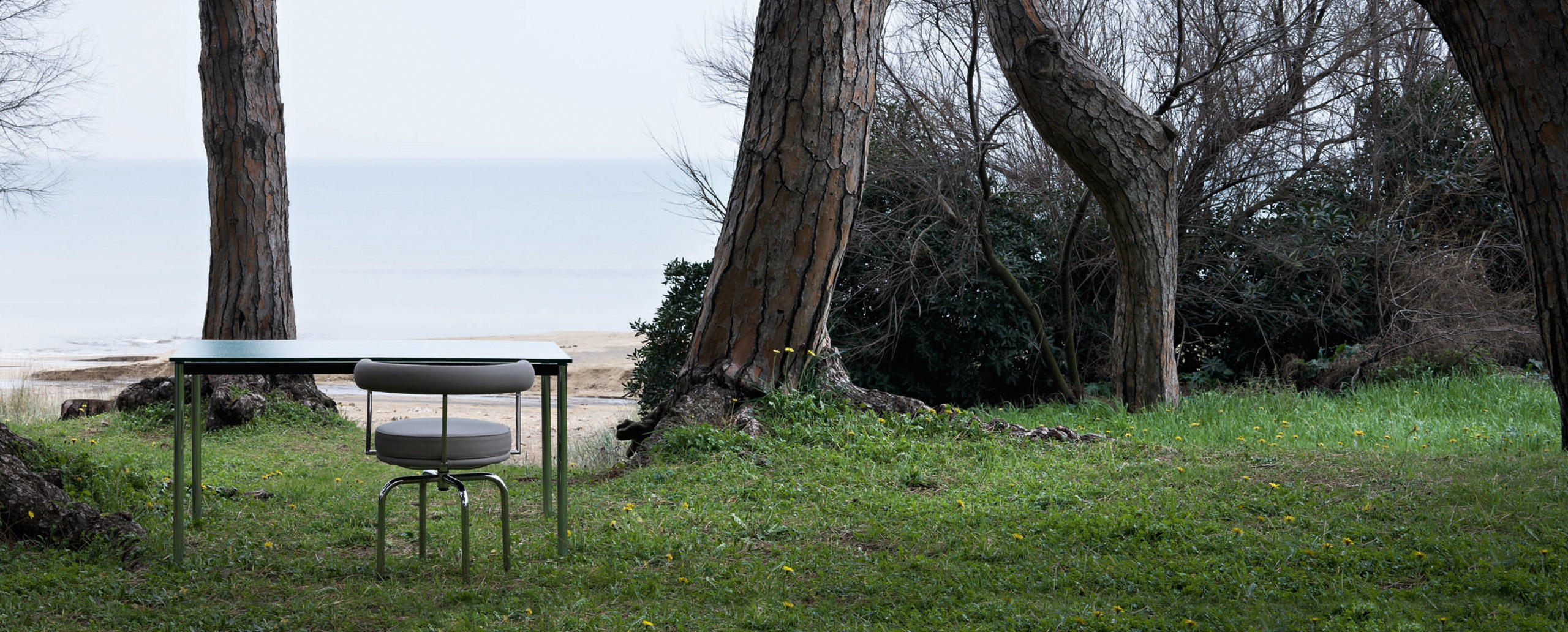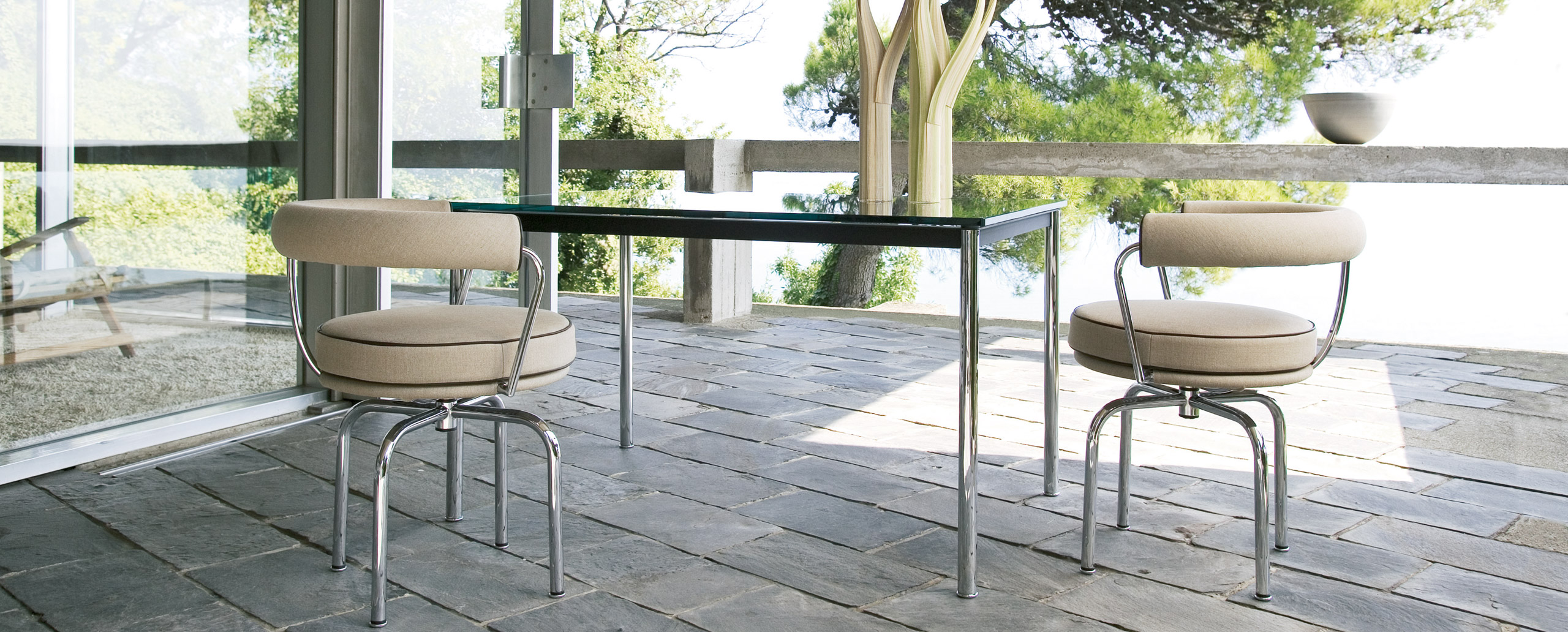 1984年改版的Charlotte Perriand LC10桌子。CR3三价镀铬钢结构涂哑光漆,有多种色彩选择:灰、淡蓝、绿、棕,泥土和象牙或黑色。玻璃台面有透明和纹理两种,15mm厚。也有户外版本。长宽高120x80x70cm, 看起来像是1929年巴黎秋季沙龙中参展的桌子,“居室的装置”的一部分。这款桌子最大地简化了框架,镀铬管状桌腿和喷漆的边饰都很极简,金属处理的表现力实现了桌子的完美效果。