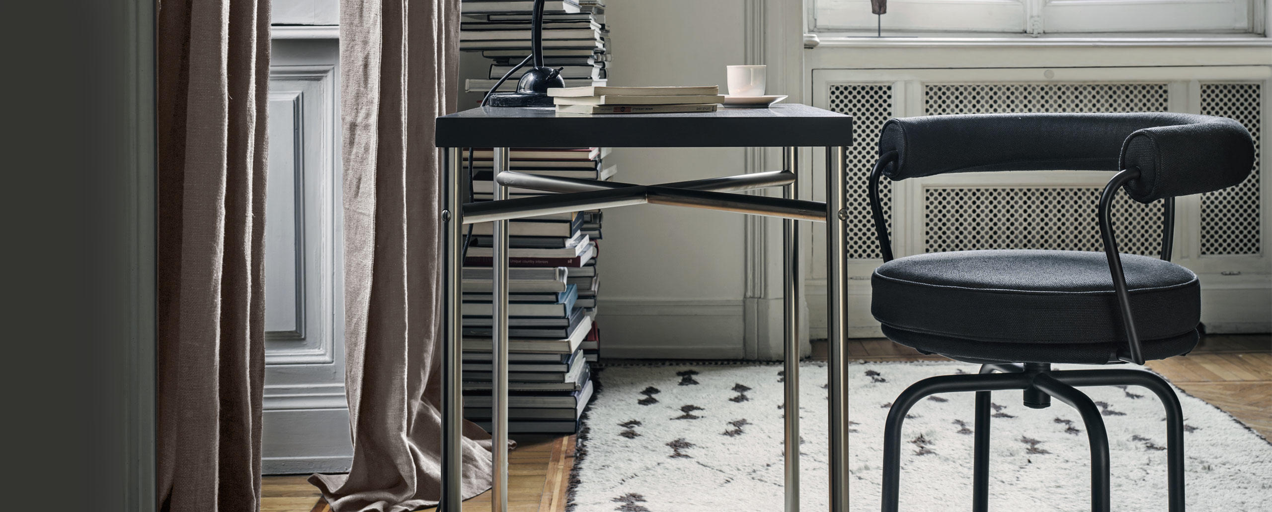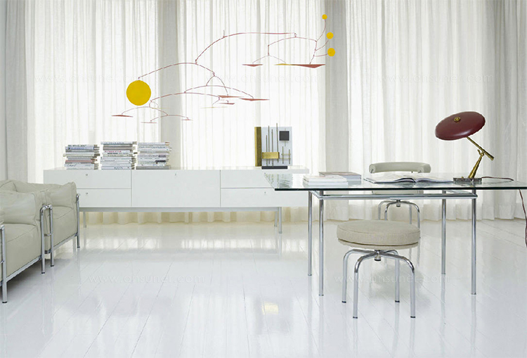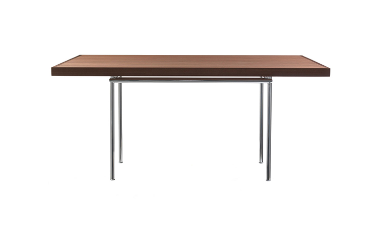 矩形桌,采用CR3三价镀铬钢结构或浅蓝色哑光珐琅钢架。桌面选用50mm厚的胡桃木或15mm厚的晶质或网纹玻璃。有2种尺寸的矩形桌面可供挑选:160x120 cm或120x80 cm,这款于1925年为La Roche House设计的桌子为不同位置带来了解决方案。他们的精髓在于支撑和被支撑两个元素之间的比例对比,也就是说:垂直形状的桌腿的最低宽度以及水平方向桌面的最大宽度。Le Corbusier的其它设计中也强调尺寸关系的对比,确认存在塑料诗意的优点,普遍通过元素角色反演、桌面与实际重量的振动大小以及桌腿与视觉精美的舒适稳定度进行表达。