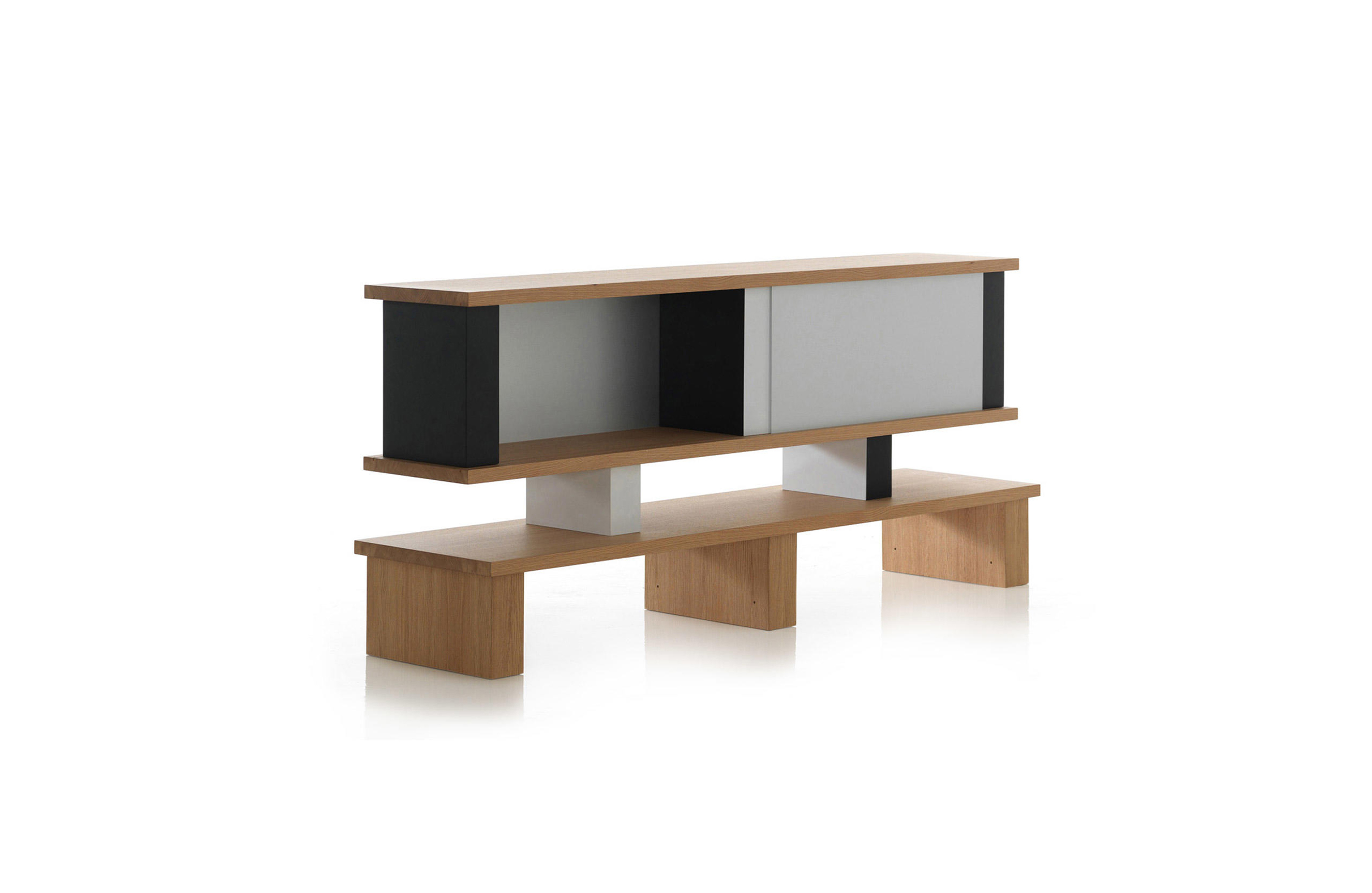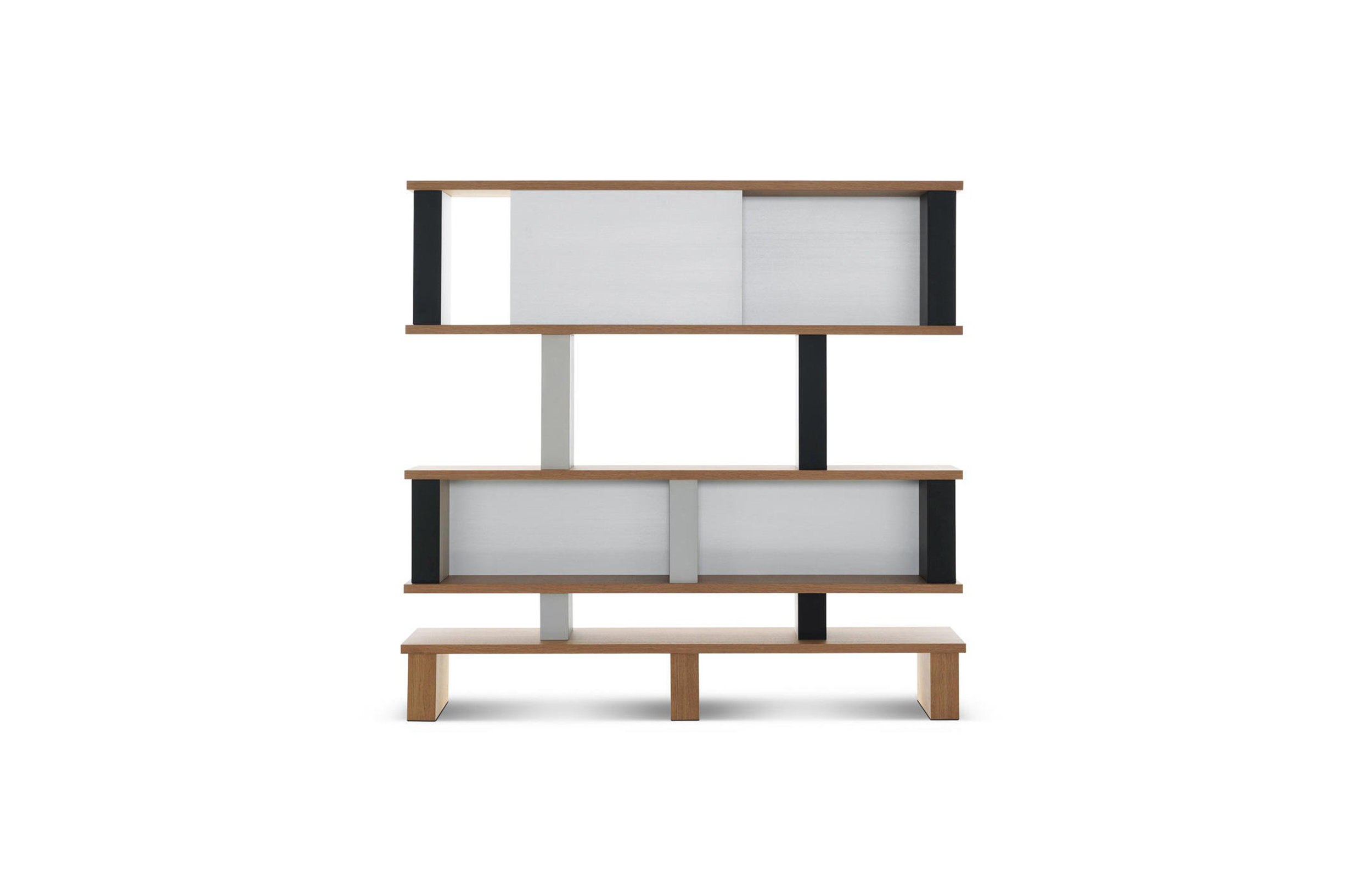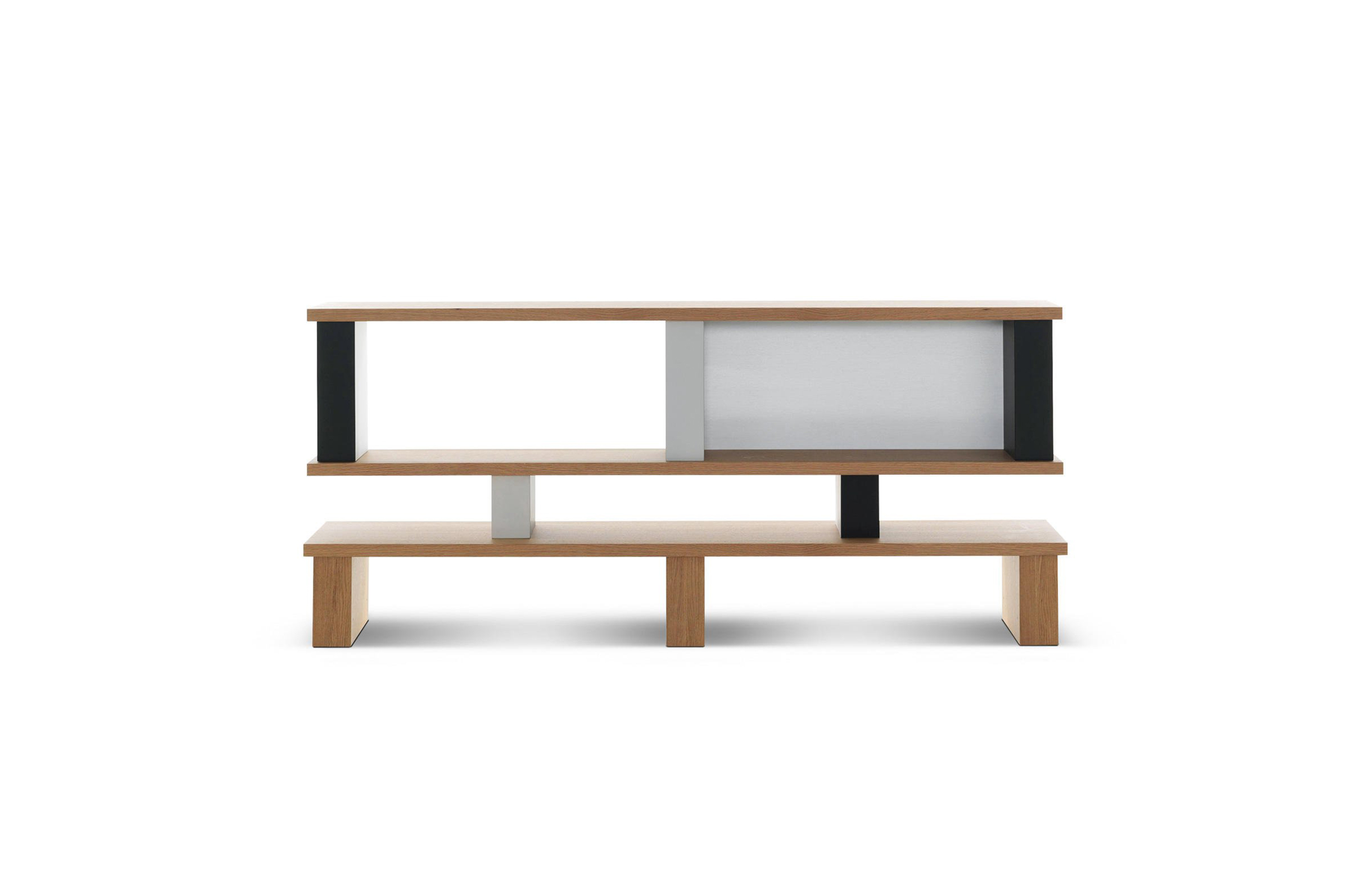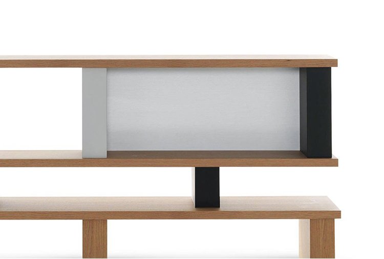 体积和空间的随心改变以及垂直结构的色彩排列变化使这款书柜极具动感。它有高、低两种款式,书架用天然橡木并在垂直方向交替漆以黑白双色。 滑动装置镀有缎铝阳极氧化膜。