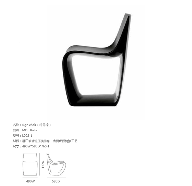 Sign系列座椅是由意大利设计师Piergiorgio Cazzaniga于2006年为MDF Italia公司设计,并在同年的米兰家具展上正式推出。该系列设计共分为:座椅、扶手椅和躺椅三款,外形均是由一种空洞形状作为标准基础,通过不同高度的演变,进而形成了具有强烈一致性的三部曲座椅。该系列座椅的流线型表面贴合人体曲线,因此其具有高度的舒适感,其独立支撑的构架是采用聚酰胺经过流动浇铸而成,表面涂有高质量的丙烯酸涂料,为座椅表面提高了光泽度、耐磨度及硬度,衣物或日常生活中所造成的小磨痕都可用一般家具清洁亮光剂轻松除去。Sign系列座椅带有一个直径为9毫米的排水孔,更加利于人们在户外使用。此外,该座椅还配有4种不同的小脚垫,且易于更换,这除了可以保护座椅本身外,也可以避免移动摆放时对地面造成损伤,对于陶瓷、木制、地毯、油毯等地面都很适用。该系列的三款座椅均分为红、白、黑、黄四色。