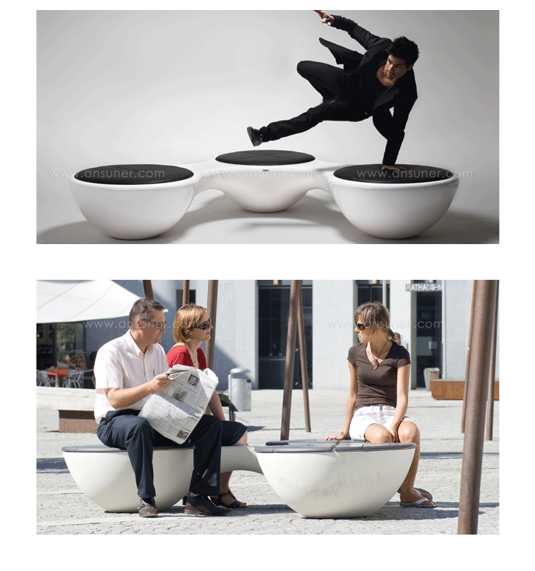 瑞典设计师Jangir Maddadi设计的这款联合座凳系列,可分为双座,三座及多坐,我司主要推出两座及三座,分别为:Union 2-seater Bench(联合双座凳)和Union 3-seater Bench(联合三座凳)。大家都知道,一般的座椅都是可以一个人或多个人一起坐,相互之间都不会受到影响。而这款连体休闲座椅却不同,外形很像一只陀螺,使用起来很像一个不倒翁,上面最多可以坐四个人。但是设计师并没有将这样的座椅让它们独立出现,而是用三张同样的座椅链接在一起,并且形成一个90度的直角,这样无论是陀螺还是不倒翁,都会很稳定的供给我们使用。当然,理论上来说,生产这种椅子,不仅可以做3件连体,4个,6个……都可以做。只是要考虑运输问题,或许3个是最完美的。这款连体休闲座椅不仅外形很优秀,而且还更加实用,使坐在上面的人有更多的空间,而且还可以保持面对面的互动。