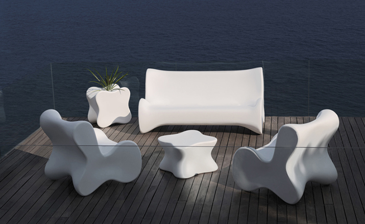 Karim Rashid,当代最耀眼, 最多杰出作品的美国设计师,为西班牙VONDOM品牌设计了50个方案的作品,最终,它们归在6个系列。在这6个系列中,最突出的是DOUX系列, 一个器官造形的,友善的,色彩奔纷的。。。手绘出来的自然形状让你想触摸它,坐在它上面,享受它。 多功能性和未来感是这个系列最突出的元素。DOUX的桌子是多功能的 - 当躺下时,它是一张桌子,在中间的位置有一个孔,可以储存东西;当站立时,它变成了一个优雅的花器或一个可以放香 槟或酒的冰桶。