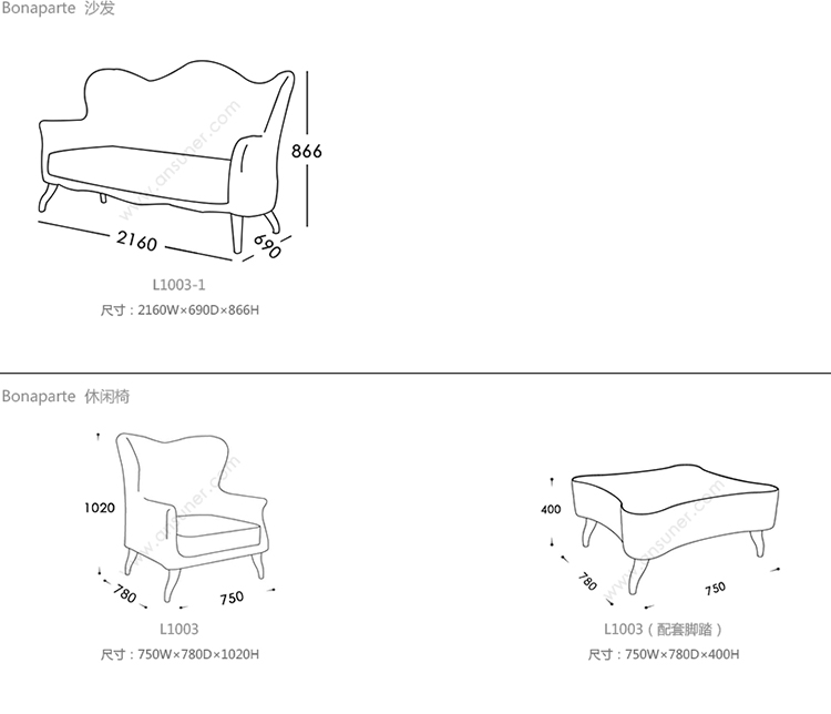 Bonaparte 沙发 系列尺寸/示意图