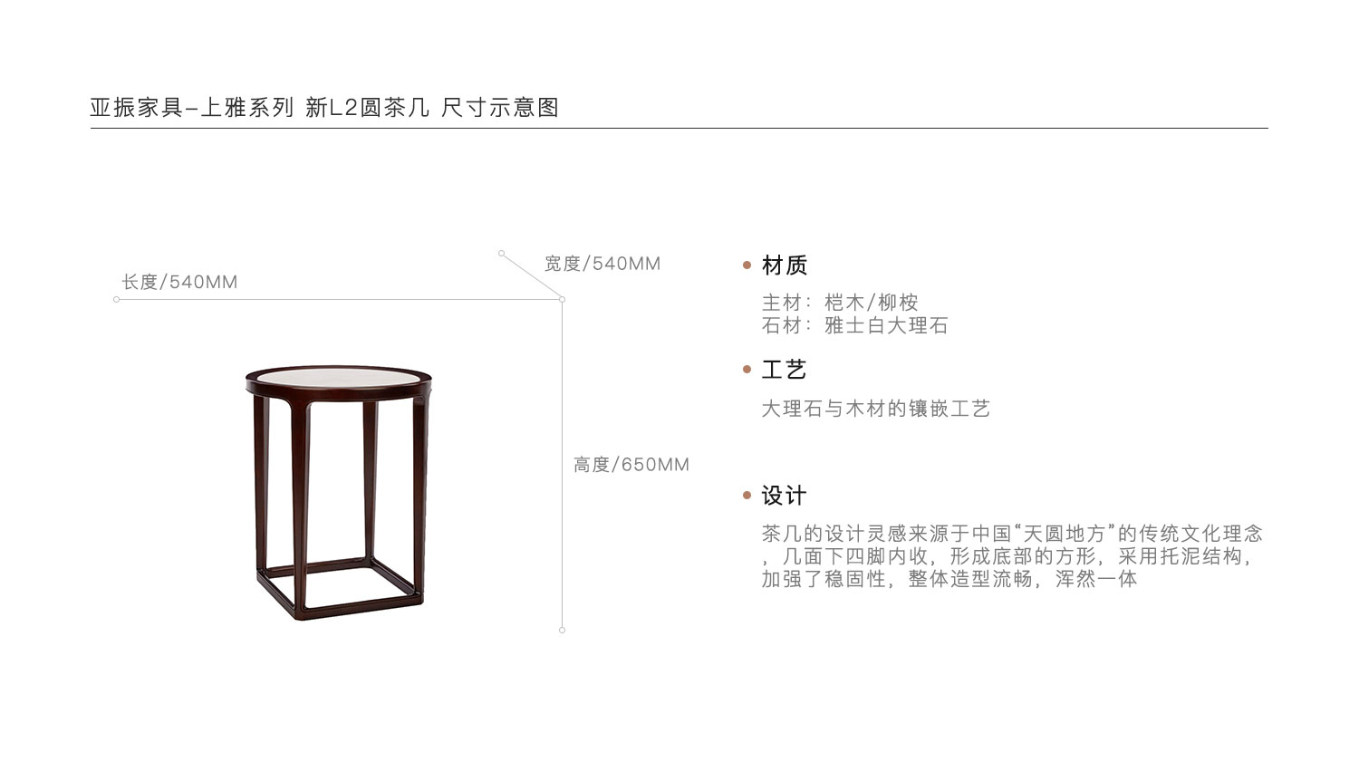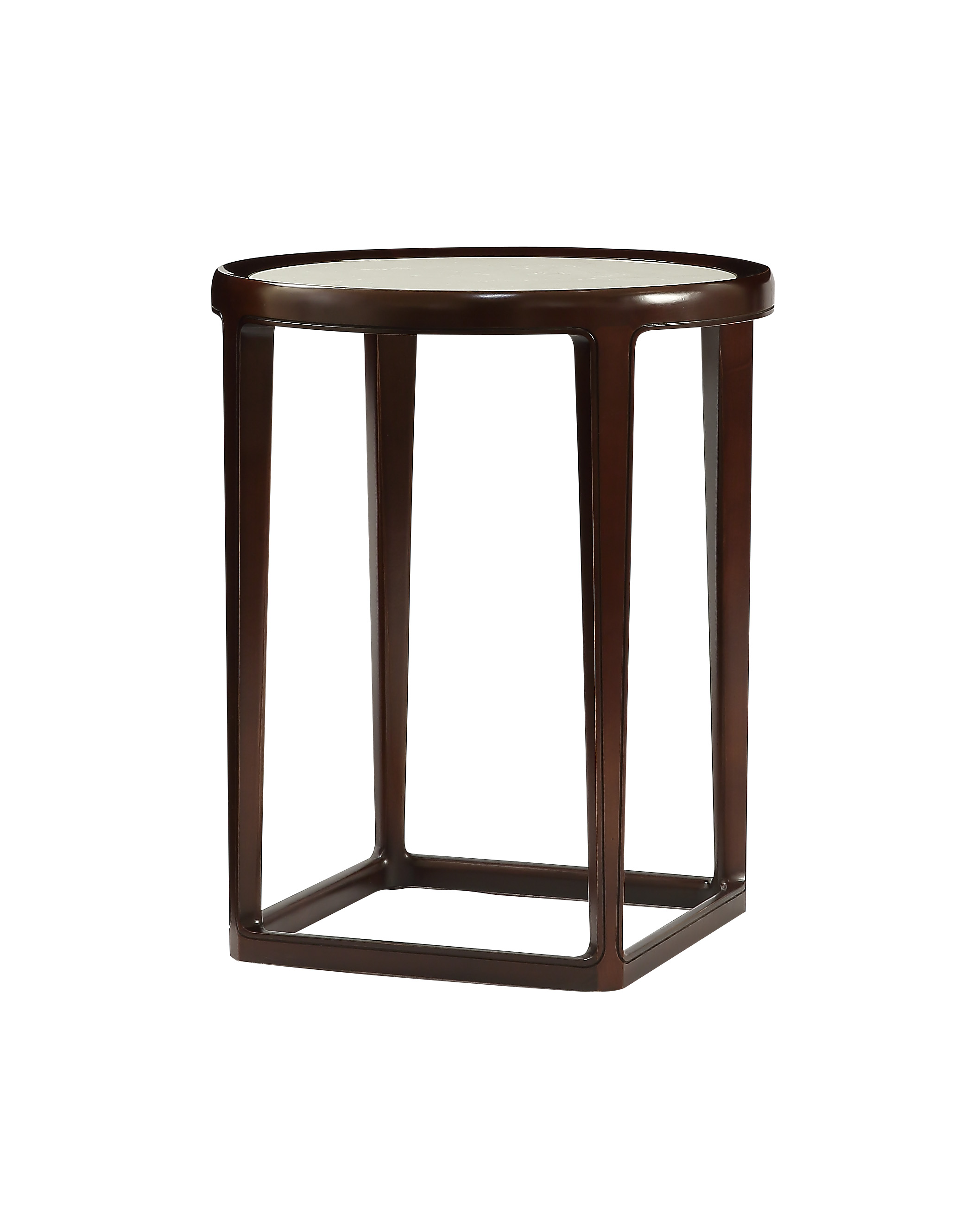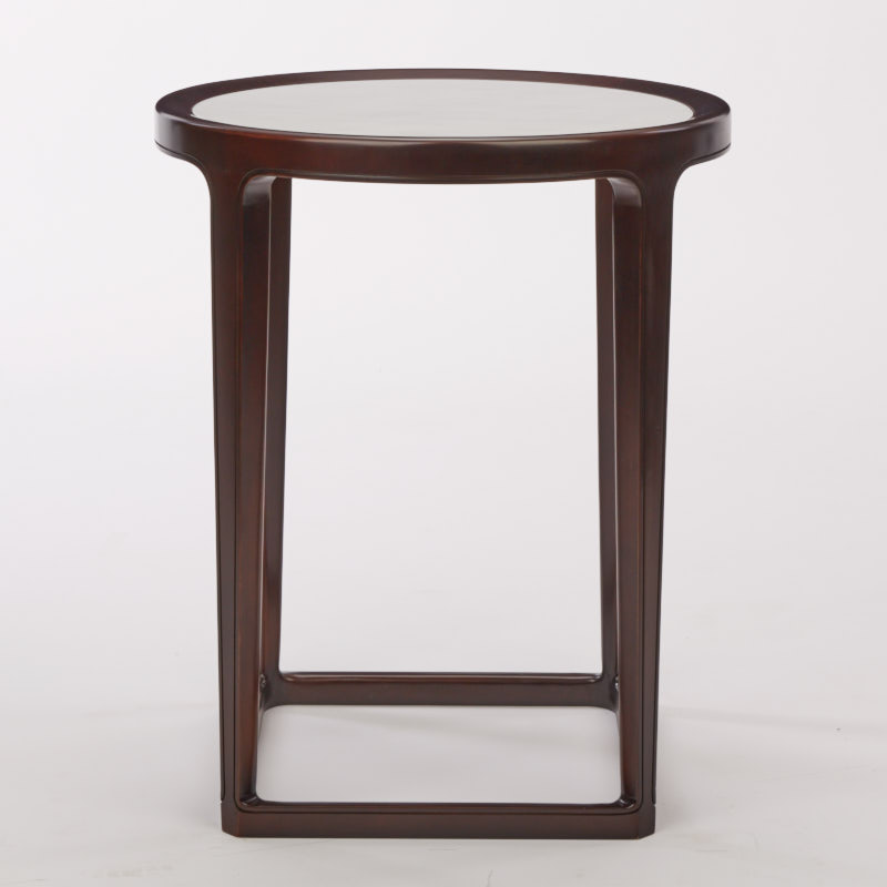 茶几的设计灵感来源于中国“天圆地方”的传统文化理念,几面下四脚内收,形成底部的方形,采用托泥结构,加强了稳固性,整体造型流畅,浑然一体。