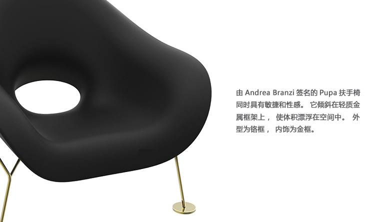 由Andrea Branzi签名的Pupa扶手椅同时具有敏捷和性感。 它倾斜在轻质金属框架上,使体积漂浮在空间中。外型为铬框,内饰为金框。