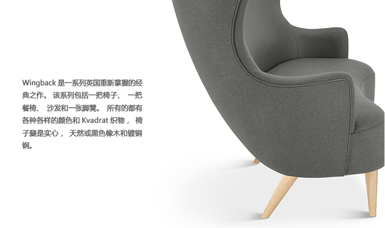 Wingback是一系列英国重新掌握的经典之作。 该系列包括一把椅子、一把餐椅、沙发和一张脚凳。所有的都有各种各样的颜色和Kvadrat织物,椅子腿是实心,天然或黑色橡木和镀铜钢。