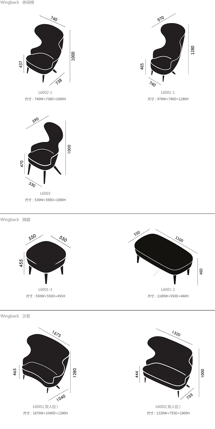 Wingback 休闲椅 系列尺寸/示意图
