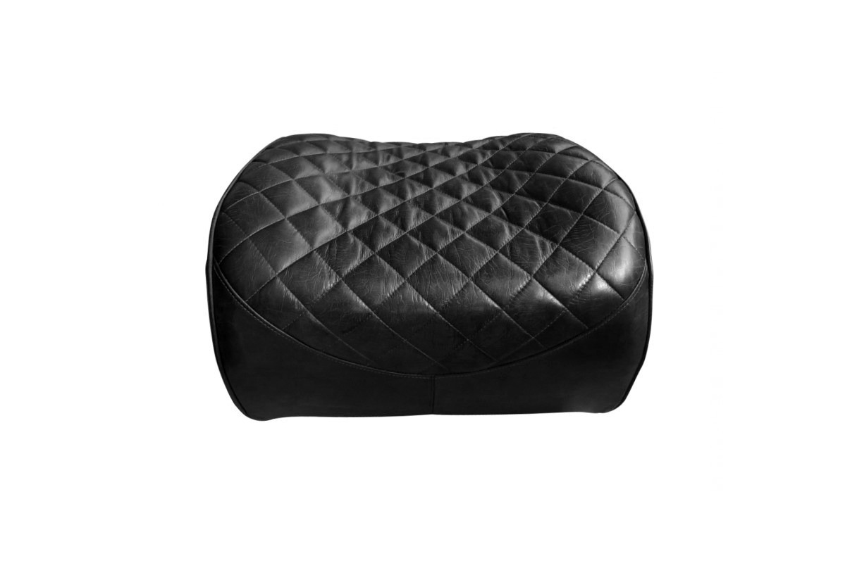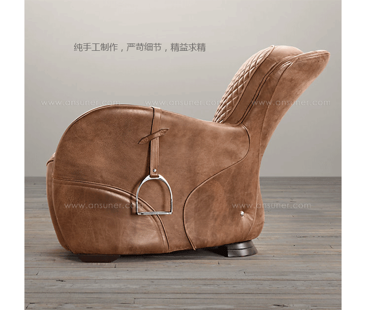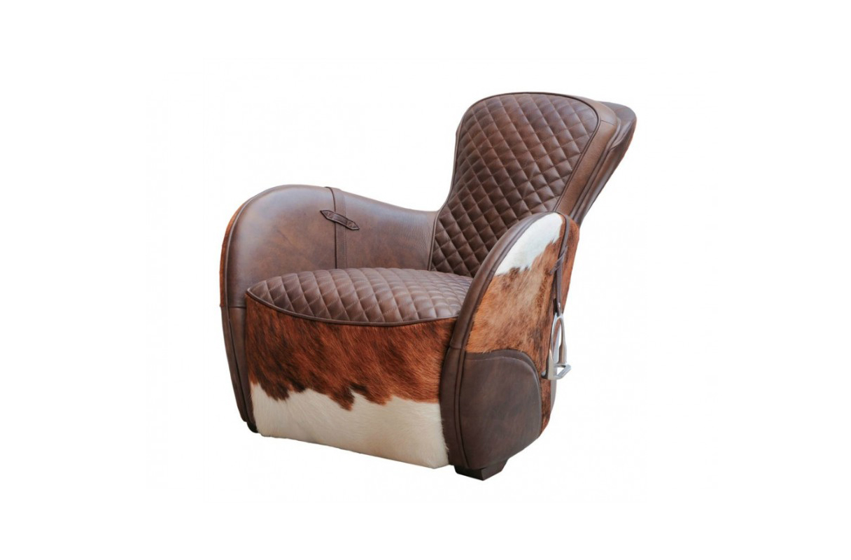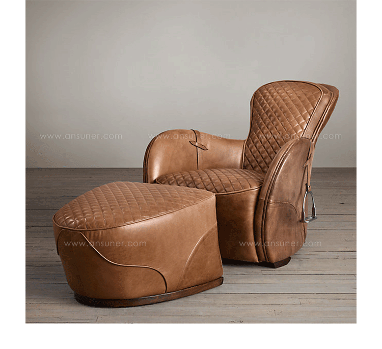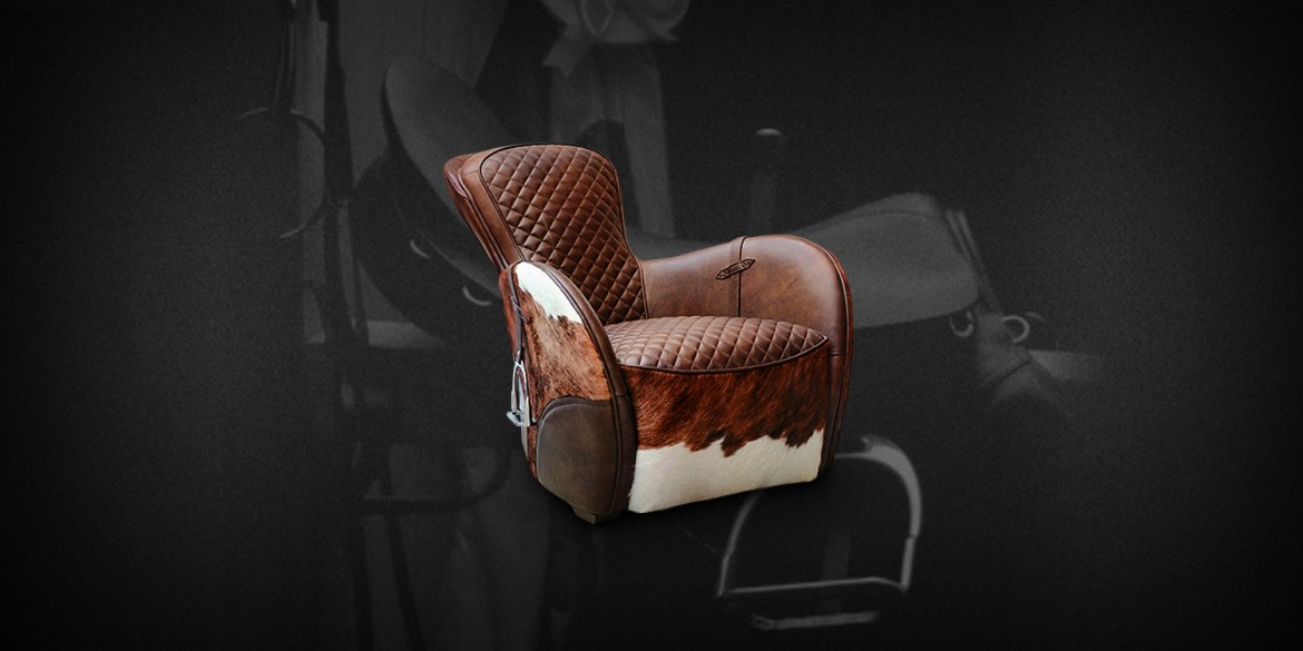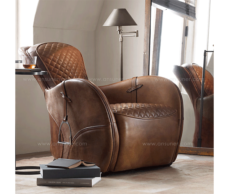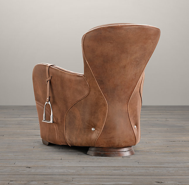 Our chair's equestrian aesthetic is informed by a traditional riding saddle, transformed into a luxurious retreat. Amply padded and swathed in panels of hand-finished leather, it features quilted stitching at the high, angled back and seat, while piping trims the rounded arms.