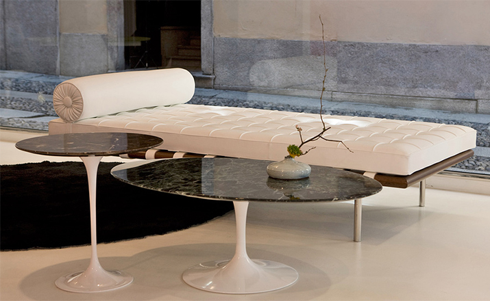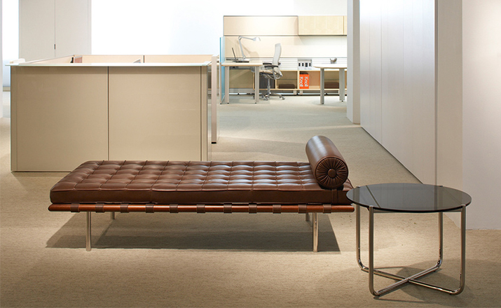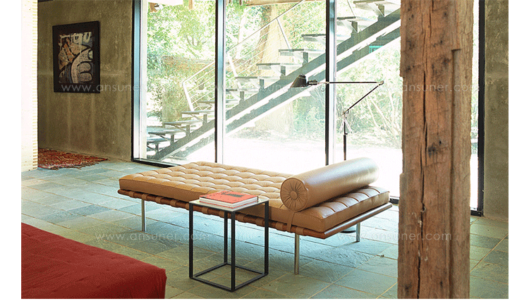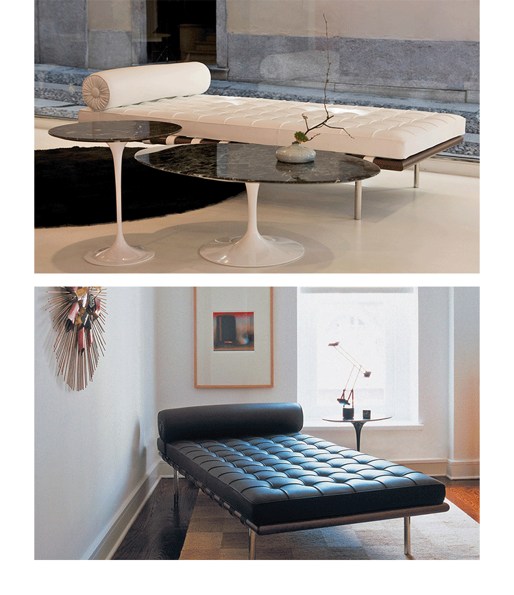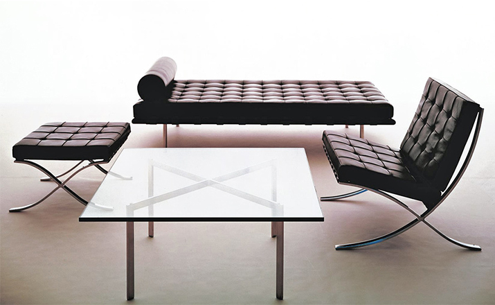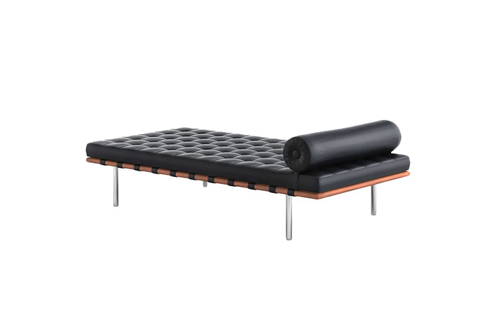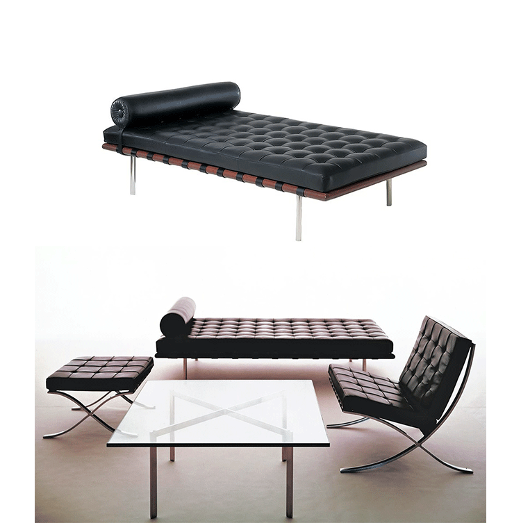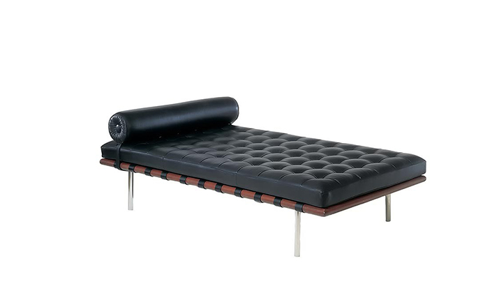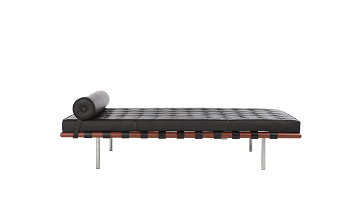 德国建筑大师Ludwig Mies van der Rohe于1929 年巴塞罗那万国博览会为德国设计德国馆,不仅设计建筑物,对于建筑物中的家具及细部家饰均非常重视的Mies van der Rohe,为了当时的西班牙国王 Alfonso 三世及皇后的大驾光临,而设计了有名的 Barcelona chair。巴塞罗那沙发床(Barcelona couch)是巴塞罗那系列产品之一,运用实木的架子,不锈钢的脚支撑配合格子状的皮革缝制,亦展现了高超的缝制技术。巴塞罗那沙发床可作为日间小憩的理想之选。